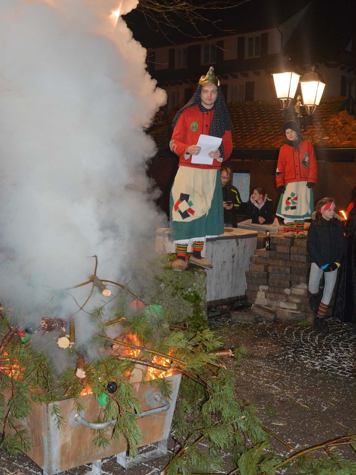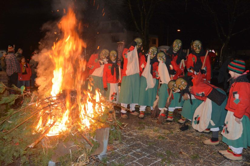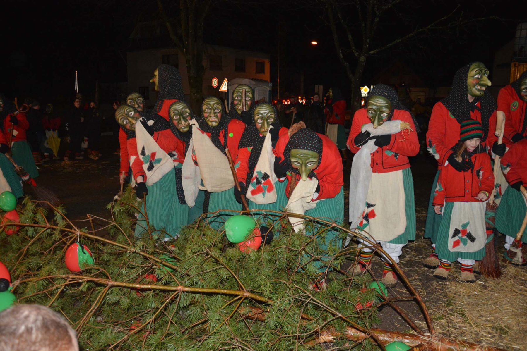 Mit roher Gewalt wurde der Narrenbaum gefällt und schlug mit Wucht auf dem Boden auf. Dann gingen die Hexe und die Äste des Baumes im lodernden Feuer auf und dichter Rauch stieg in den Nachthimmel. Und zum schlimmen Ende gingen auch die hohen Tage der Narretei unaufhaltsam zu Ende. Den Eckwaldhexen blieb da nur noch übrig, mit Jammern und Heulen das schreckliche Geschehen zu betrauern.
