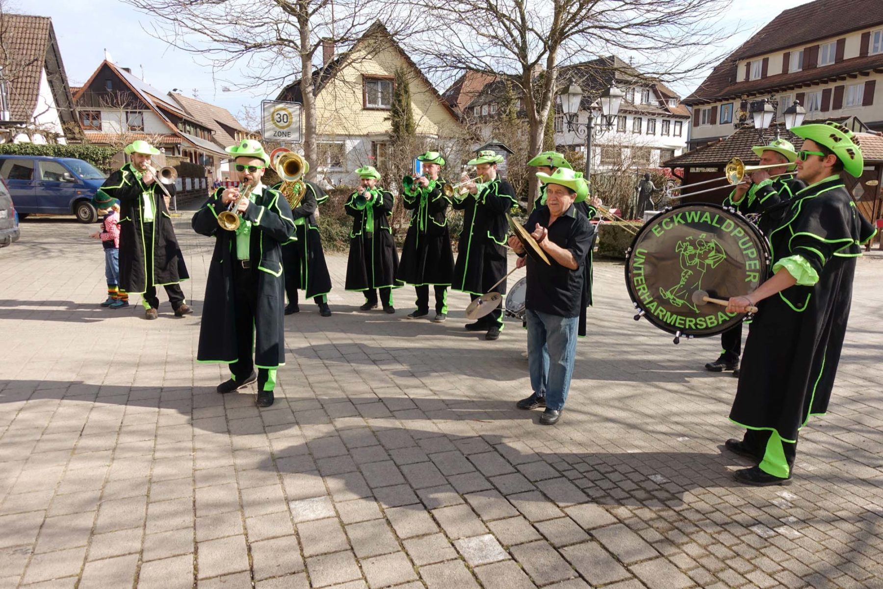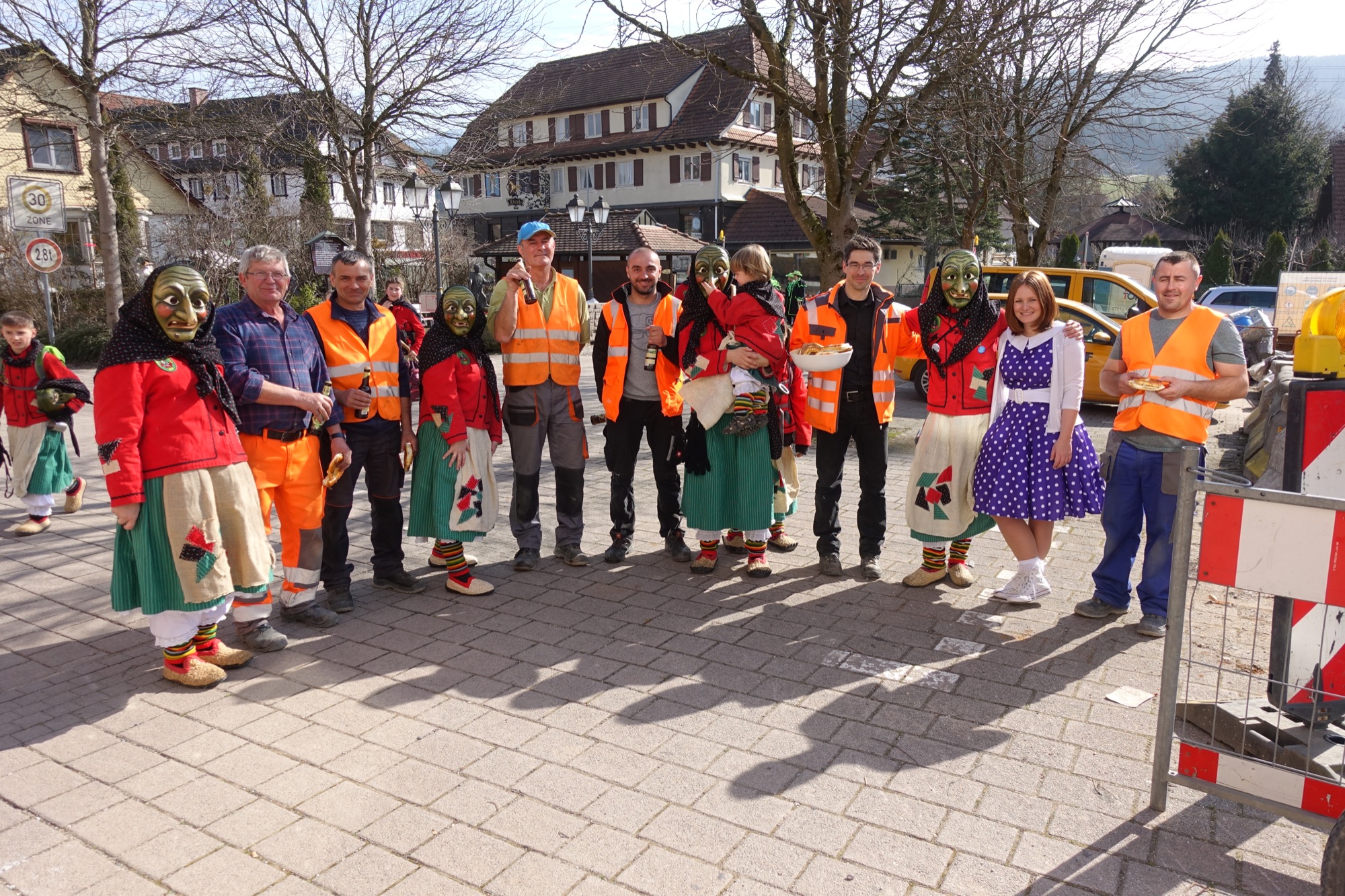 Wie bereits berichtet, ging es im Hombe am Schmutzigen Dunnerschdig rund. Aus dem Fenster des Ortsvorsteher-Büros wehte die Narrenfahne, die Guggenmusiker bliesen was das Zeug hielt und die Kindergarten- und Schulkinder durften auf dem Rathausplatz so richtig Fasent machen.