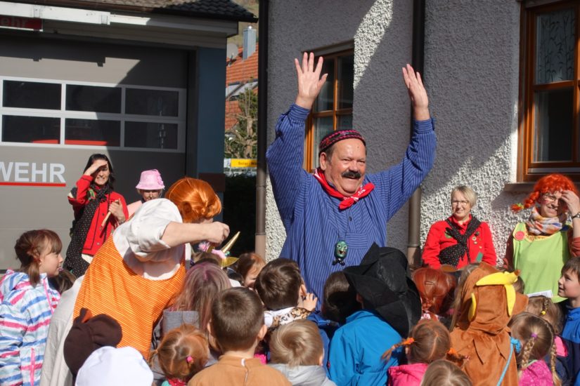 Schon traditionell ging es im Hombe am Schmutzigen Dunnerschdig rund: Aus dem Fenster des Ortsvorsteher-Büros wehte die Narrenfahne, die Guggenmusiker bliesen was das Zeug hielt und die Kindergarten- und Schulkinder durften auf dem Rathausplatz so richtig Fasent machen.