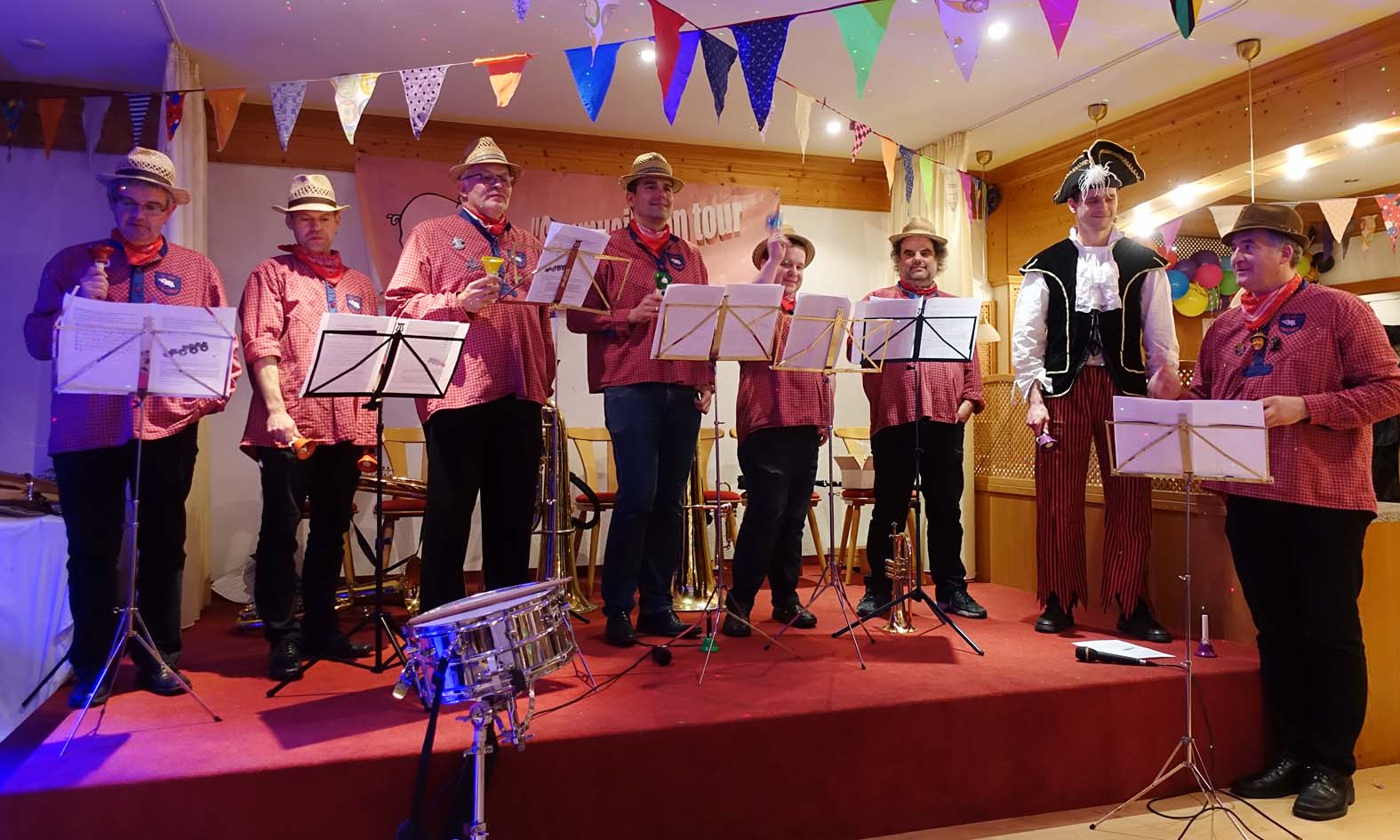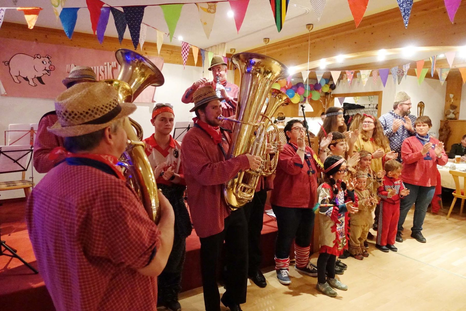 Dann ging es Schlag auf Schlag. Die Saumusiker waren wieder einmal in blendender Form und sorgten mit ihrem vierstündigen Programm vom Feinsten für Hochstimmung am laufenden Band. Patrick Friedmann, der Chef der Saumusiker, im Volksmund Friedel genannt, bewies als Regisseur, Texter, Hauptdarsteller und nun auch noch als Sänger einmal mehr, dass er soviel närrisches Blut wie kein anderer Hambacher in seinen Adern hat. Kult sind inzwischen seine Witze aus der »untersten« Schublade, die er für alle sichtbar stets auf der Bühne dabei hat.