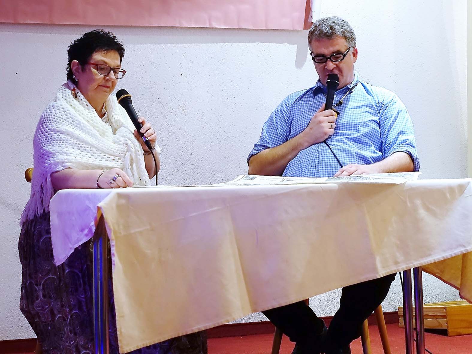 Viel hatten das Ehepaar Monika und Patrick beim Frühstück zu berichten. So, dass das Warten vor der Ampel an der L94 wunderbar ist. Apotheker Bergsträsser hat für die Autofahrer im Schaufenster ein Autokino eingerichtet, das abwechselnd Sportschau- und Tatort-Programm zeigt. Klar gestellt wurde auch, dass der Dicke, der ab und zu die Hombacher Musik dirigiert, nicht Stefan Polap ist, der 40 kg abgenommen hat, sondern der etwas breiter gewordene Vizedirigent Patrick Friedmann.