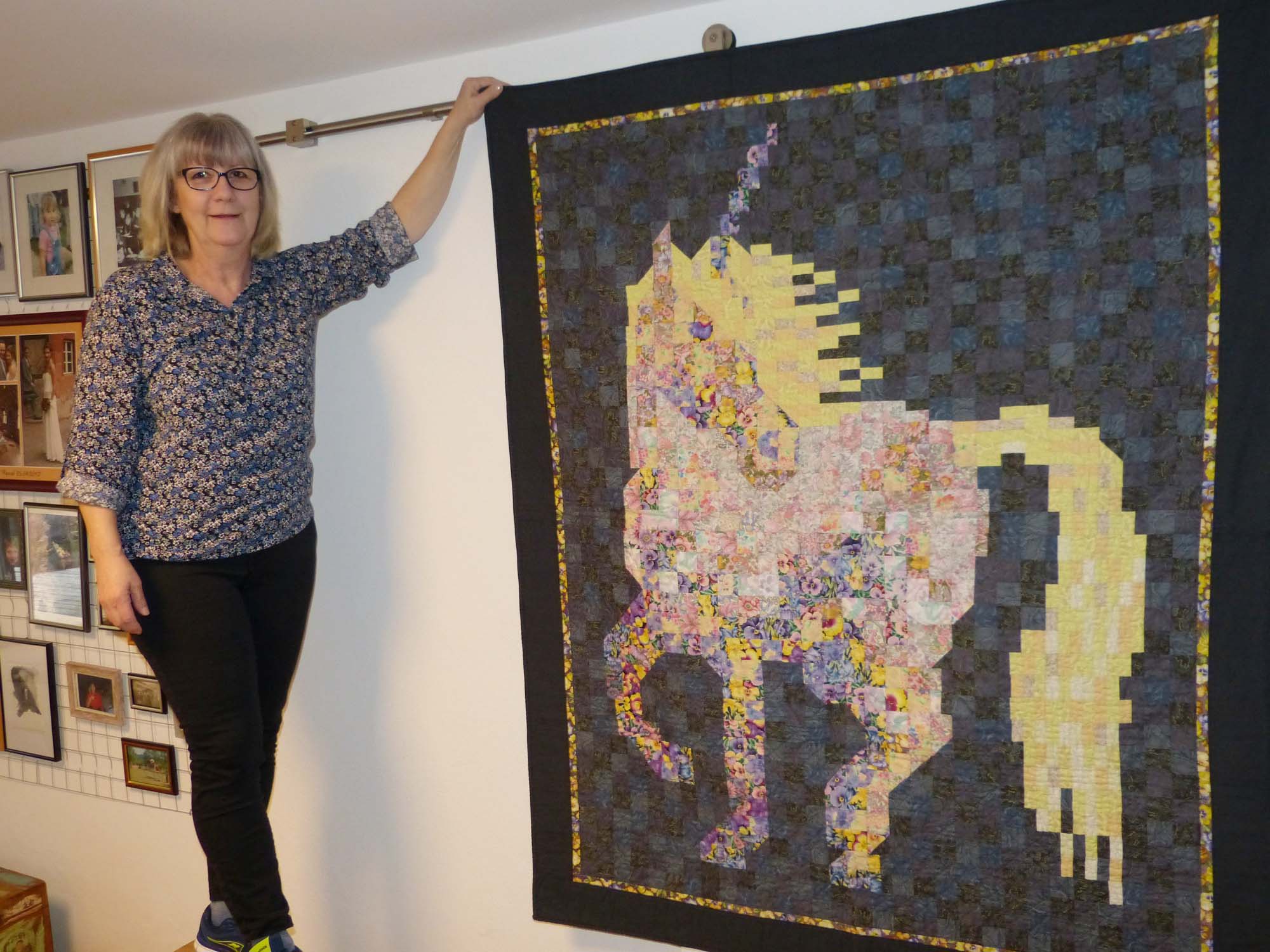 Auch ein Einhorn hat die 60-Jährige geschaffen. »Eigentlich ist ein Einhorn ja weiß«, erzählt die Spring- und Westernreiterin, die bis vor Kurzem noch ein eigenes Pferd besaß. »Aber dieses Einhorn trabt über eine vom Mond beschienene Wiese, deren Blumen sich auf seinem Fell spiegeln.«