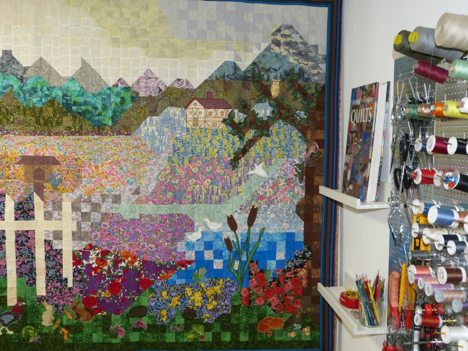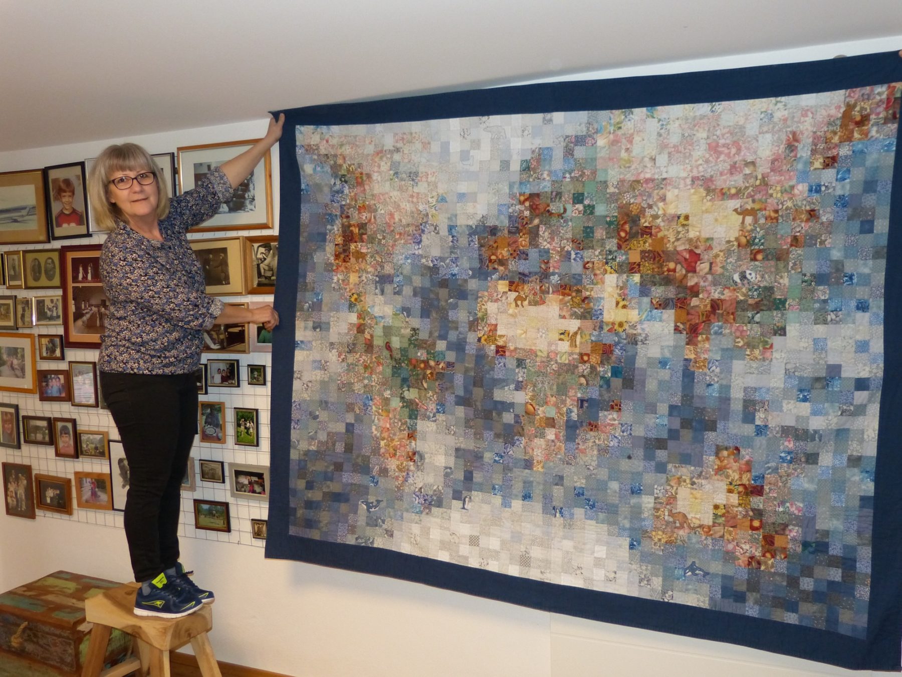 Die Motive könnten unterschiedlicher nicht sein. Darunter ein Jahreskalender mit zwölf fantasievoll genähten Bildern, die jeweils ihre eigene Geschichte erzählen. Oder ein – jawohl! – digitaler Ton im Riesenformat. Oder eine Weltkarte mit zusätzlich applizierten, für den jeweiligen Kontinent typischen Tieren – als Geschenk für ihren Gatten, einen einstigen Berufspiloten. Oder eine riesige, von der Abendsonne angestrahlte Himmelswolke.