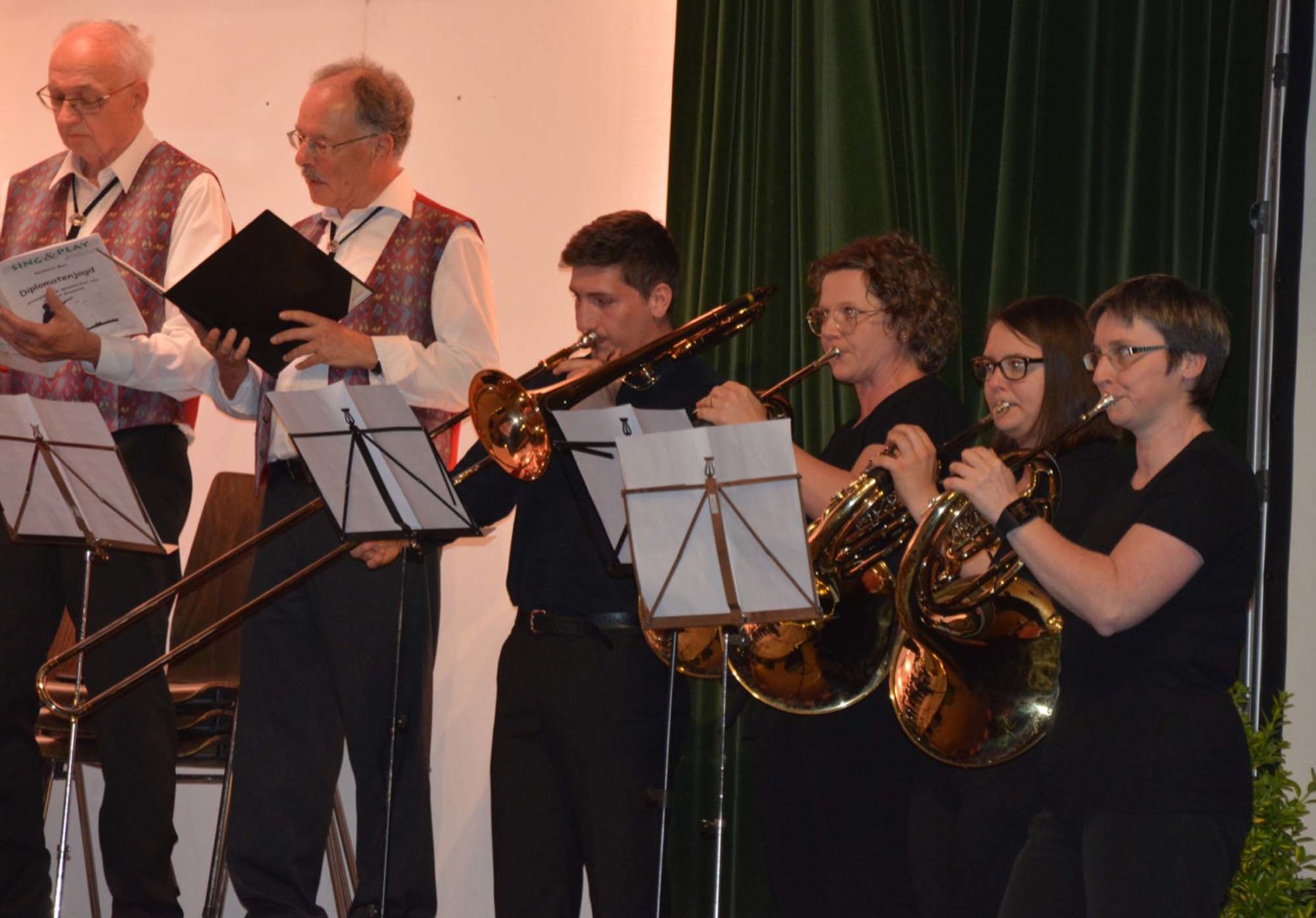 Der Männerchor kann nicht nur volkstümlich sondern auch international. Mit dem weltbekannten »Banana-Song« »Come Missa Taliman« eröffnete der Chor unter der Leitung von Dirigent Thomas Dreher das große Finale des Osterkonzerts 2019. Wild her ging es bei Reinhard Meys »Diplomatenjagd«. Das Bläserquartett Amelie Dreher, Dagmar Zimpfer, Patricia Zimmermann und Benedikt Christ – Aktive der Musikkapellen von Zell und Unterharmersbach – sorgten dabei für echte Waidmanns-Stimmung. Das schallende »Horido« der Männerstimmen und die knallenden Schüsse von Schlagzeuger Achim Bührer brachten den Außenminister zu Fall und die hoben die prächtige Stimmung in der Schwarzwaldhalle weiter an.