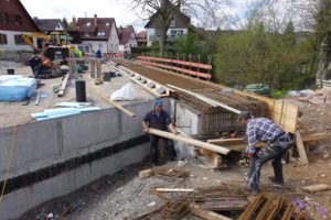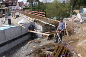 Auch bei der Rösslebrücke wurde mit Hochdruck gearbeitet. Der linke Gehweg talaufwärts wurde aufgebaut und eingeschalt. Spezialpersonal, sogenannte »Eisenbinder«, sorgten für die entsprechende Armierung. Heute erfolgte die Betonierung. Unmittelbar nach den Osterfeiertagen wird der rechte Gehweg nach gleichem Muster hergestellt. Am 25. April wird die Brücke mit dem Gußasphalt überzogen, der für die Dichtigkeit der Brücke sorgt. Polier Christian Zimmermann: »Danach folgen noch einige Restarbeiten. Spätestens Ende April wird dann von uns die Baustelle geräumt.« Die Firma Reif wird dann die Asphaltschichten aufbringen und die Anschlüsse zwischen Rösslebrücke und L94 auf beiden Seiten herstellen. Nachdem die Ampeln im Bereich »Schwarzer Adler« seit Montag verschwunden sind, wird es noch im Bereich Umfahrung Kurgarten eine Ampel auf beiden Seiten geben. Das vorgegebene Ziel, statt wie ursprünglich vorgesehen in drei Jahren bereits in zwei Jahren das Mammutprojekt L94 zu vollenden, rückt näher.