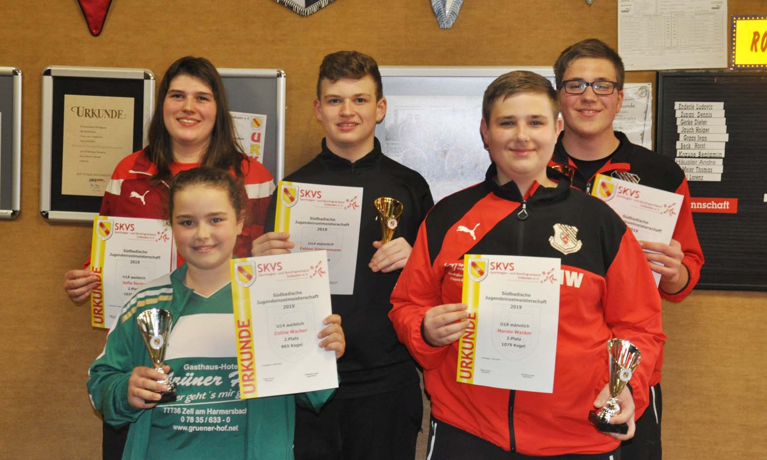 Bei den U18 Jungs erzielte Mathias Prinzbach mit 481 Kegel Platz 15. Jannik Lehmann schaffte die Qualifikation und belegte mit 512 + 457 = 969 Kegel den zwölften Platz. Nicolas Boschert war mit Platz acht und 520 Kegel ins Finale gekommen und spielte dort mit 536 Kegel die zwischenzeitliche Bestmarke und hatte am Ende 1056 Gesamtkegel erzielt. Marvin Wacker ging mit 536 Kegel von der Qualifikation von Platz drei ins Rennen. Im Schlussquartett war der Führende Freiburger Jonas Stratz (581 + 554 = 1135 Kegel) auch nicht mehr einzuholen. Da es hier drei Startplätze für die Deutsche Meisterschaft zu vergeben gab, sollten die zwei weiteren Tickets also die drei verbliebenen Finalisten unter sich aus machen. Marvin Wacker, der Qualizweite Marijan Valjak vom ESV Villingen und der Qualivierte Moritz Walz aus Singen. Von Bahn zu Bahn konnte sich dann der Unterharmersbacher weiter absetzen. Marvin Wacker erspielte sich mit 543 Kegel im Finale auf 1079 Kegel und gewann im ersten U18 Jahr den Südbadischen Vizetitel. Und wie bei den Senioren A in Singen beharkten auch hier sich die weiteren Finalisten. Marijan Valjak (540 + 512 = 1052 Kegel) rutschte so auf Rang fünf ab und Moritz Walz (534 + 522) kam auf 1056 Gesamtkegel. Kurzes Rechnen, somit waren Moritz Walz und Nicolas Boschert gleichauf. Was bedeutet, dass das Abräumergebnis zu Gunsten des Besseren entscheidet. Am Ende sollte der Unterharmersbacher mit fünf Kegel dort die Nase vorne haben. Und so machte Nicolas Boschert das Hombacher DM Jugendquartett zu einem Quintett.