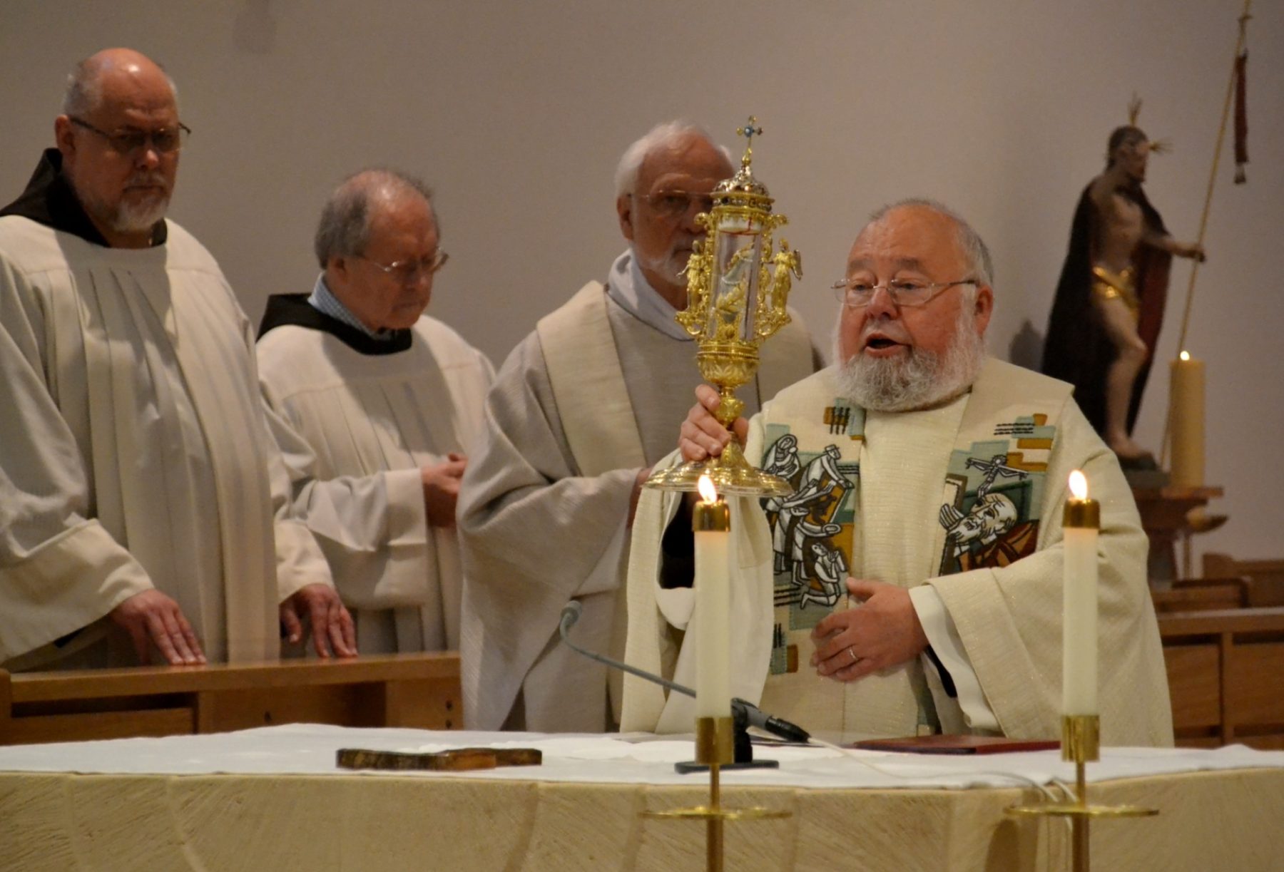 Pater Norbert mit dem Bruder-Konrad-Schrein beim Festgottesdienst anlässlich 85 Jahre Heiligsprechung.