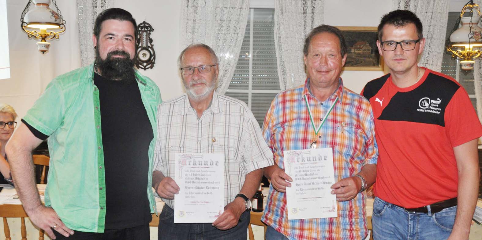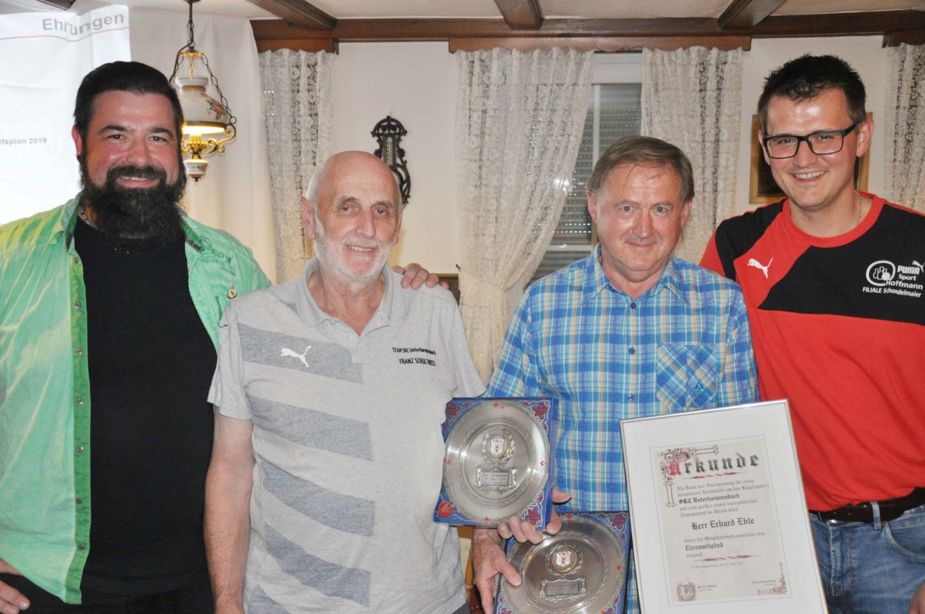 Markus Wacker bedankte sich bei Franz Schultheiß und Erhard Eble mit einem kleinen Präsentkorb für den Einsatz bei der Bahnpflege. Lobende Worte richtete der 1. Vorsitzende an Richard Schöner, welcher Jahrzehnte lang in der Vorstandschaft viel für den Verein geleistet hat, und an Fabian Boschert für die Jahre als Beisitzer und 2. Sportwart. Sie freuten sich ebenfalls über einen Präsentkorb. Markus Wacker wurde von Axel Schondelmaier für 30 Jahre Mitgliedschaft im Verband geehrt. Günter Lehmann und Josef Schwendemann durften die goldene Ehrennadel samt Urkunde für vierzig Jahre aktive Mitgliedschaft im SKC Unterharmersbach entgegen nehmen. Ergänzend zur Ernennung zum Ehrenmitglied im letzten Jahr bekamen Franz Schultheiß und Erhard Eble noch den Ehrenteller für die Ehrenmitgliedschaft überreicht.