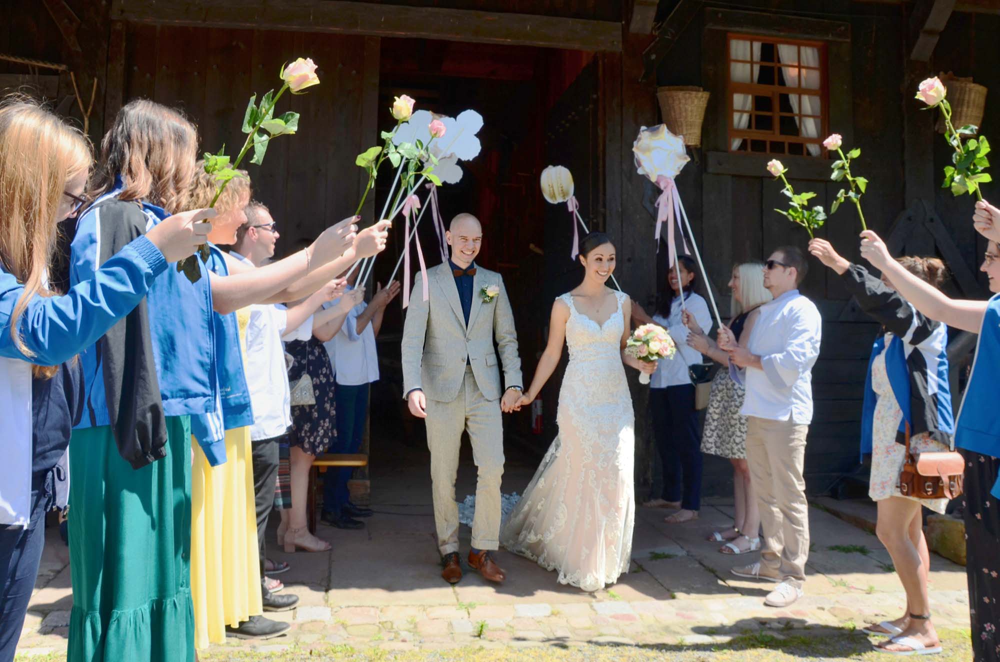 Nach der Trauung begleiteten Arbeitskollegen und Tanzfreundinnen das Brautpaar auf den ersten Metern im Eheglück. Am »Streckenrand« hatten sie sich zum Spalier aufgestellt – jubelten dem Brautpaar zu und zeigten ihre Freude über die Verbindung.