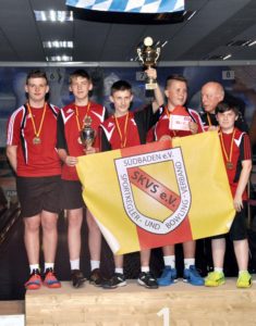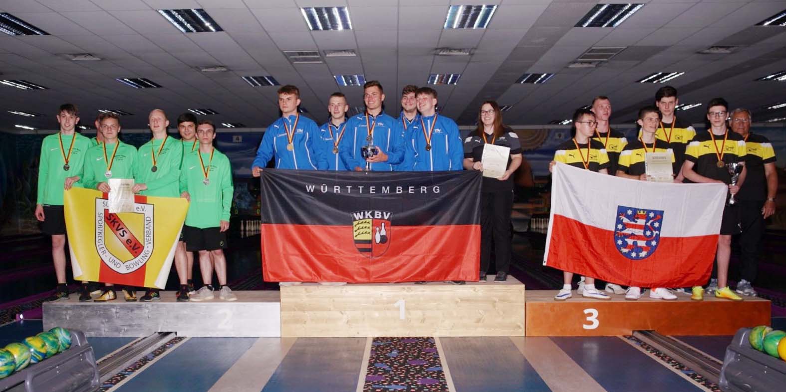Bei den U18 Jungs war die SKG Singen am Drücker. Adrian Sailer (548 Kegel), Moritz Walz (556 Kegel), Jonas Stratz (565 Kegel) brachten Singen in Front. Doch der württembergische Titelverteidiger TSV Denkendorf hatte mit Tim Brachtel (573 Kegel) noch ein ganz heißes Eisen im Feuer. Nicos Dalhammer (524 Kegel) hatte alle Hände voll zu tun, einen Treppchenplatz für Singen und Südbaden zu verteidigen. Am Ende war es dann mit zwei Kegel Vorsprung der Vizetitel vor dem KK Saale-Orla aus Thüringen und hinter dem alten und neuen Deutschen Meister TSV Denkendorf.