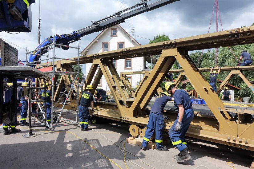 Die Brücke war seit Mitte September 2018 im Einsatz gewesen. Jeweils 30 Helfer der drei THW-Ortsverbände zwischen 19 und 66 Jahren montierten an den vier Einsatztagen die 32 Meter lange Behelfsbrücke mit doppelter Fahrbahnbreite wieder auseinander und zerlegten sie in eine Vielzahl von Einzelteilen. Dabei mussten über 5.000 Schrauben entfernt werden. Hilfe kam sogar aus Bayern. Vom THW Ortsverband Freising waren drei für den Brückenbau bereits ausgebildete Helfer gekommen, um Erfahrungen mit dem Bau und Abbau einer Brücke in dieser Dimension zu sammeln. Die Arbeiten liefen wie am Schnürchen. Planung und Ausführung waren auf den Millimeter genau gelungen. Als dann am Sonntagabend alle Einzelteile transportbereit geordnet auf dem Platz lagen, waren alle erschöpft, aber froh und glücklich.