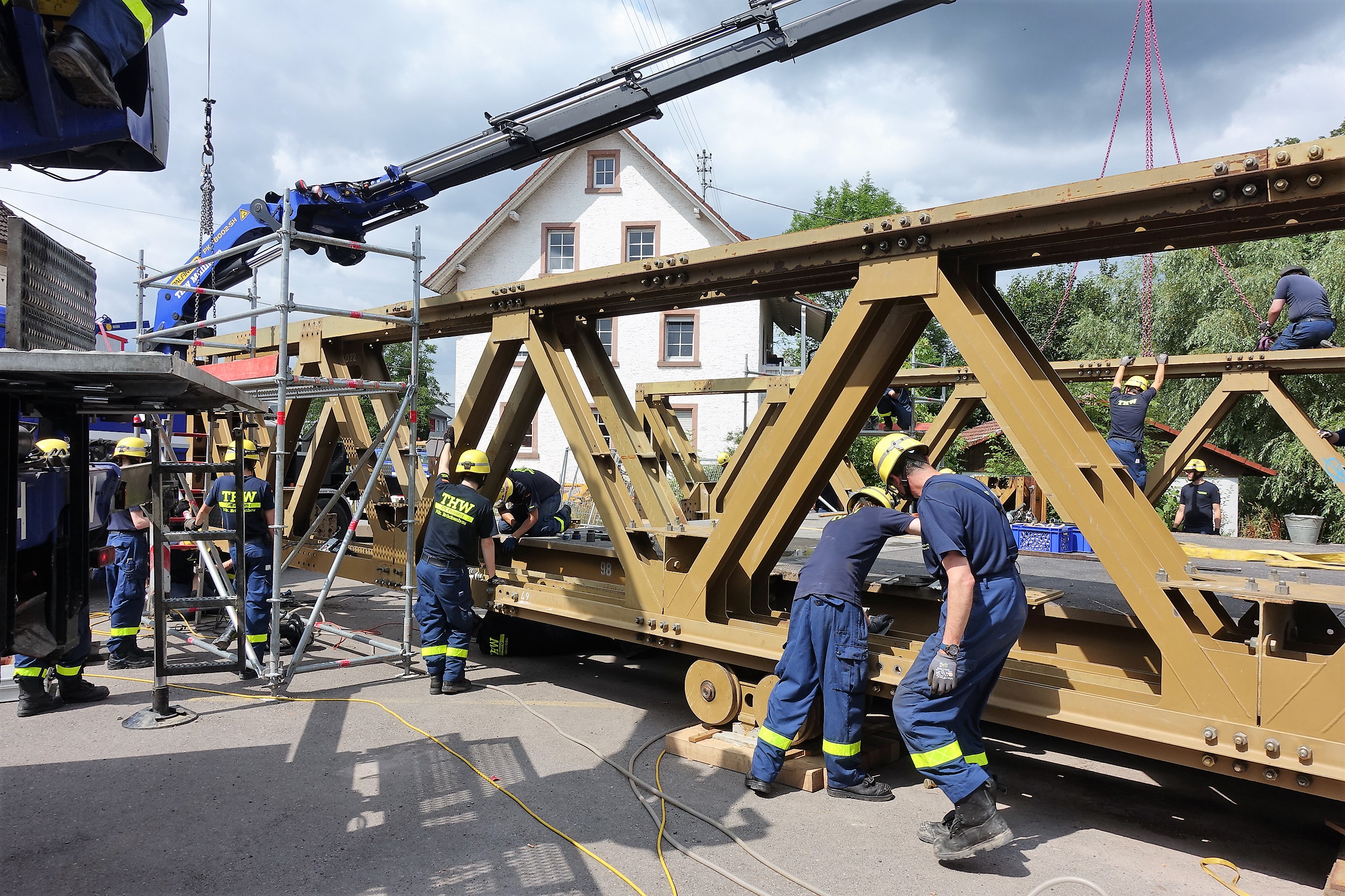 Höchste Genauigkeit war notwendig, wenn beispielsweise eine der elf Fahrbahnplatten mit den Kranen hochgehoben und zum Lagerplatz gehievt wurde. Jeweils acht Helfer an beiden Seiten der schweren Platten sorgten dafür, dass die schwierige Aktion ohne Zwischenfälle gelang. Unter den schattigen Bäumen am Fürstenberger Hof gab es Ruhepausen und Verpflegung. Die THW-Mannschaft übernachtete in den Räumen des THW Biberach. Doch zuvor war der Besuch des Motorradfestes am Kinzigdamm eine willkommene Abwechslung nach der harten Arbeit.