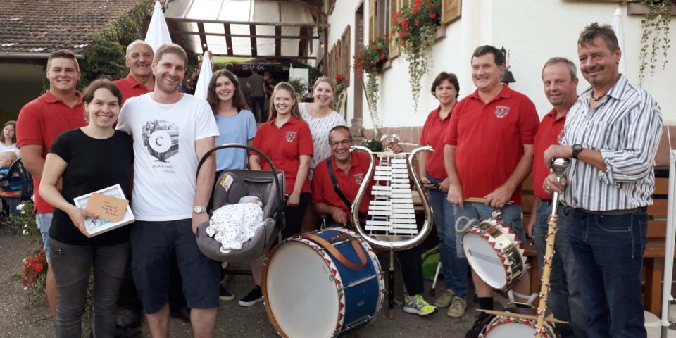 Einen Grund zum Gratulieren gab es kürzlich für Vorstand und Tambomajor der Bürgerwehr Unterharmersbach Josef Roth. Andreas Gutmann, stellvertretender Tambomajor, und seine Frau Veo wurden am 4. Juli stolze Eltern des kleinen Samuel. Josef Roth übergab im Namen des Spielmannszug den frisch gebackenen