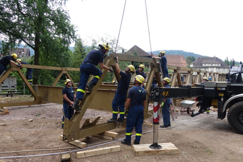 Am Samstag wie am Sonntag waren unter der Führung der Gruppenleiterin Fiona Mager jeweils zwischen 25 und 30 Helfer des THW vor Ort, um die Kurgartenbrücke – mit 32 Metern Spannbreite und zwei kompletten Fahrbahnen, eine der ganz großen Behelfsbrücken – wieder rückzubauen. Der Anbau des Vorschubschnabels, der die Brücke wieder auf festen Boden bugsieren soll und weitere Vorbereitungsarbeiten, wurden mit Hilfe zweier Autokräne und der routinierten Helfer gut gestemmt. Am nächsten Wochenende, 13. und 14. Juli, wird die Brücke auf den großen Platz an der Ochsenmühle gezogen und demontiert. Danach werden die Einzelteile im Laufe der übernächsten Woche auf Spezialfahrzeuge geladen und zurück an ihren zentralen Standort gebracht.