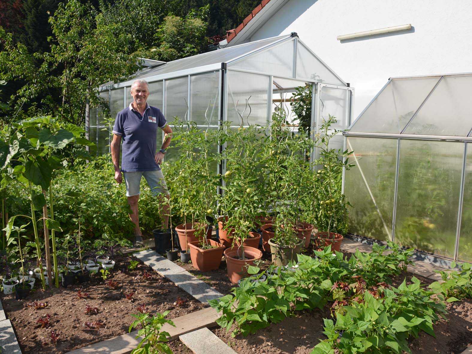 »Ich bin zwölf Monate Selbstversorger«, stellt der leidenschaftliche Hobbygärtner fest. Elmar Männle baut in seinem Garten die verschiedensten Gemüsesorten von Radieschen über Rote Bete bis hin zu Salaten an. Außergewöhnlich sind die verschiedenen Tomaten- und Kartoffelsorten. In einem Hochbeet wachsen Ur-Karotten, die außen schwarz und innen gelb-rot sind und sich durch ihr besonderes Aroma auszeichnen. Stolz ist Elmar Männle auf sein neues Gewächshaus, das er im Frühjahr zur Aufzucht der Sämlinge nutzt und in dem jetzt üppig und fruchtbeladen die Tomaten ranken.