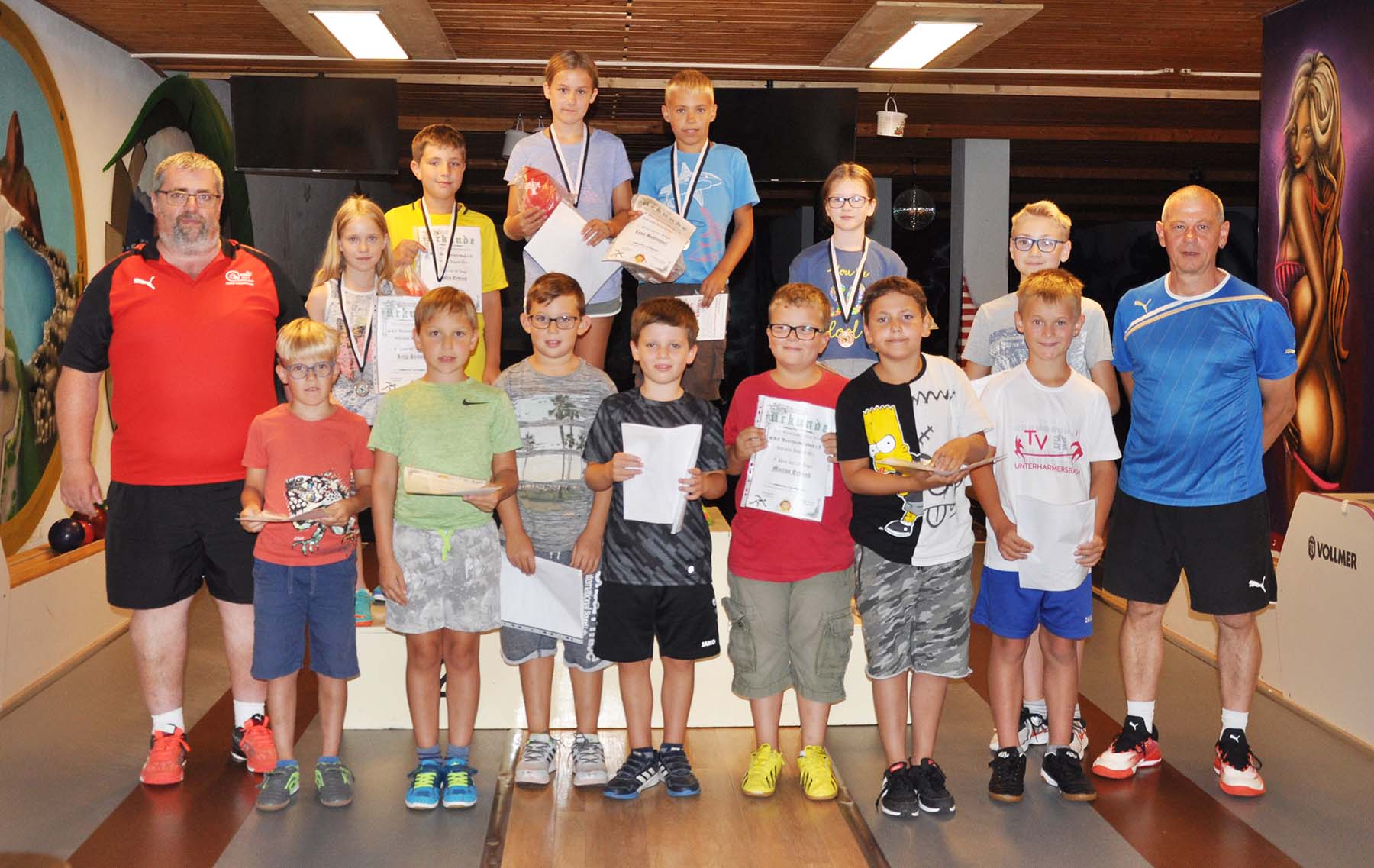 Bei den U11 waren gleich elf Mädels und Jungs am Start. Knapp verlief dort das Ringen um den zweiten Platz. Mit 49 Kegel belegte Maximilian Moryakhin den vierten Platz. Vier Kegel mehr waren es, die seine Schwester Katharina Moryakhin zu Fall brachte und so mit 53 Kegel Platz 3 erspielte. Wiederum einen Kegel mehr erzielte Lena Krämer. Mit 54 Kegel konnte sie auf Platz 2 klettern. Mit 60 Kegel war dann Leon Hoffmann nicht zu stoppen. Er wurde Sieger bei den U11. Auf den weiteren Plätzen folgten Dennis Hug mit 40 Kegel auf Platz 5, Bela Szojak mit 26 Kegel auf Platz 6, Marius Erdrich mit 20 Kegel auf Platz 7, Moritz Seyfried mit 18 Kegel auf Platz 8, Marcel Lehmann mit 18 Kegel auf Platz 10 und Philipp Leopold mit 13 Kegel auf Platz 11.
