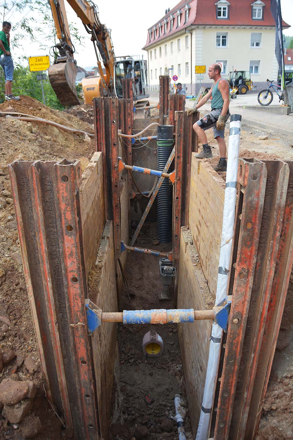 Die gesamte Baumaßnahme beinhaltete nicht nur die Erneuerung der Straßendecke, sondern die komplette Erneuerung der über 100 Jahre alten Wasserleitung sowie der örtlichen und überörtlichen Abwasserbeseitigung. Außerdem erfolgte die Verlegung der Stromständer von den Dächern in die Keller der Anwesen, die Ausstattung der gesamten Strecke mit Leerrohren für die Breitbandverkabelung, sowie die Ver-legung neuer Gas- und Telefonleitungen. Teilweise musste mehrere Meter tief ge-graben werden, um alle Versorgungsleitungen erneuern zu können.