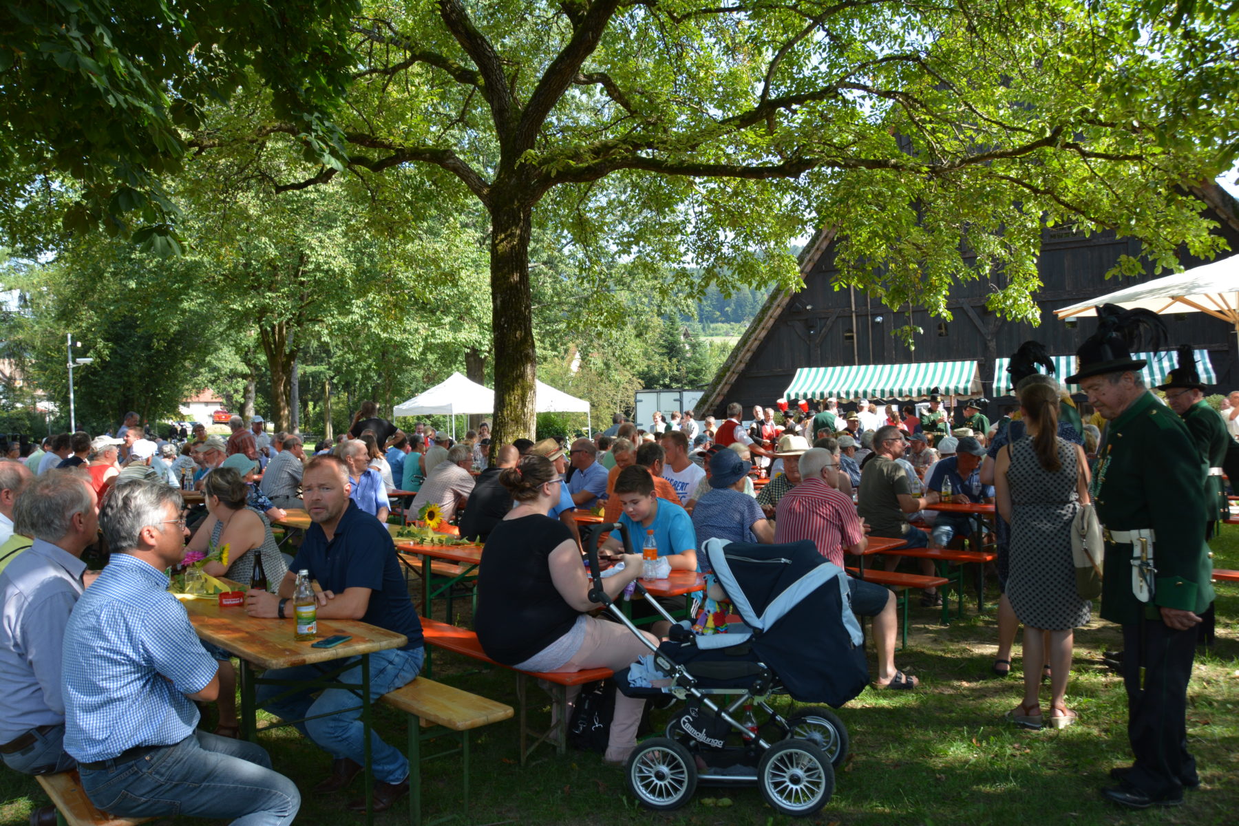 Auch die Bürgerwehrler, die Trachtenfrauen und die Musiker, die den Festakt feierlich umrahmt hatten, traf man auf der Wiese. Sie hatten eine anstrengende Stunde hinter sich und mit bewundernswerter Disziplin Großartiges geleistet. Sie waren zuvor in der prallen Sonne pflichtbewusst ihrem ehrenhaften Dienst nachgegangen.