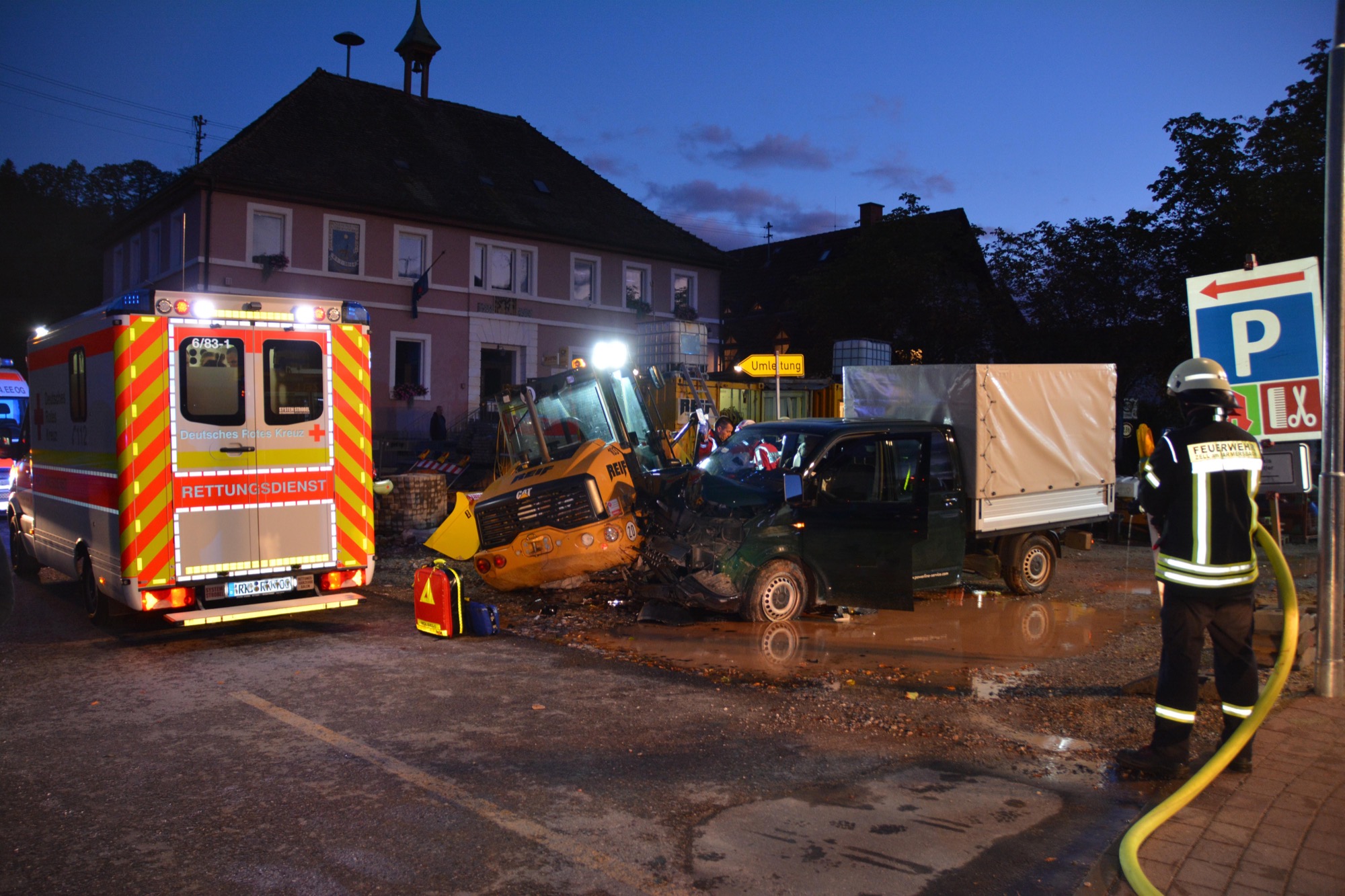 Zu einem schweren Verkehrsunfall ist es am heutigen Montagmorgen mitten in Unterharmersbach gekommen. Ein Kleintransporter kam von der Hauptstraße ab und krachte auf dem Rathausplatz gegen einen dort geparkten Radlader. Im Einsatz waren die Rettungskräfte von DRK und Feuerwehr.