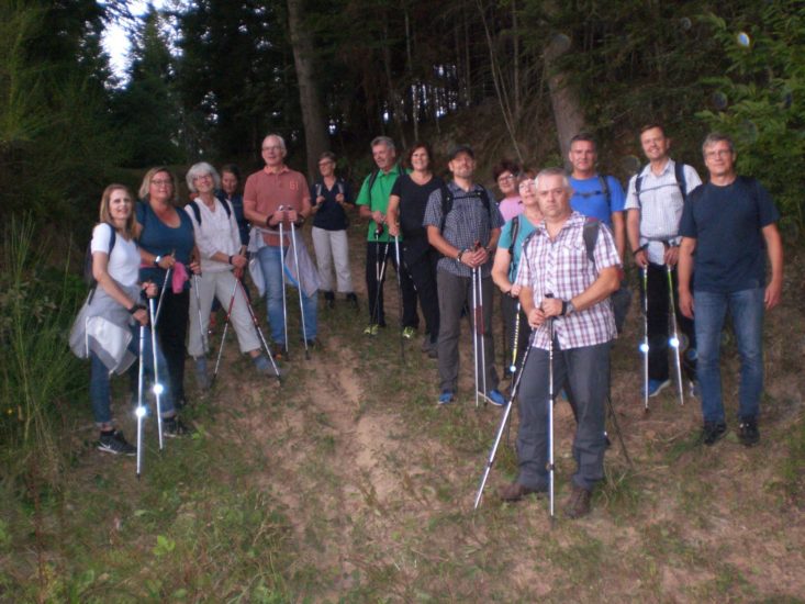 Die Nordic Walker mit Führer Michael Horst brachen in Richtung Fürstenberger Hof auf und liefen über den Panoramaweg zur Radiumquelle. Nach einer Erfrischung dann der Anstieg auf »über Eck«. Dort bot sich ein fantastischer Blick nach Wes­ten auf die untergehende Sonne. Der Abstieg durch den mittlerweile dunklen Wald folgte in Richtung Oberburehof. Beim Verlassen des Waldes oberhalb der Höfe präsentierte sich der gerade aufgegangene Vollmond zunächst leicht wolkenverhangen, dann in voller Pracht. Es war der perfekte Augenblick und ein erhebendes Erlebnis.