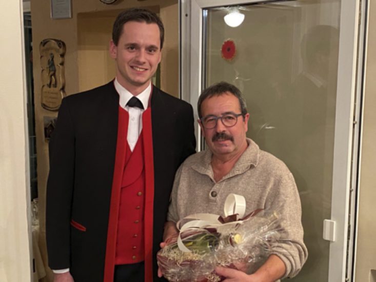 Die Musikerinnen und Musiker wünschen ihm alles Gute für sein kommendes musikalisches Lebensjahr. Der erste Vorstand Christian Vollmer überreicht Werner Fix stellvertretend für alle ein Geschenk.