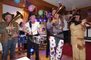 Im Hombe werden ja die Wirtschaften so langsam rar. Abhilfe schaffte da wenigstens am Saumusikabend eine Neueröffnung als Western Saloon. Alle Ehrengäste sind bestens bekannt: »Ein Klavierspieler, Sheriff Lucky Luke, Old Shatterhand, Indianer Manni-tu. Aus den heimischen Gefilden waren Little Huge-Joe. General Joe Bolisch, Longshoe Ground Joe und Chicken Joe. Es ging wild her, Schießereien am laufenden Band, vollen Flaschen (zum Glück aus Zucker), die reihenweise auf den Köpfen zerschellten und von Cowboy Old Shatterhand (Roland Fehrenbach) eine Kostprobe, dass er noch schneller reden als schießen kann. Nach diesem mitreißenden Finale wurde noch lange unvergessliche Hambacher Fasent gefeiert.