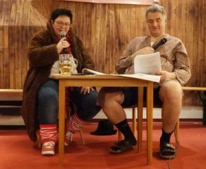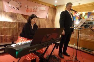 Ein Höhepunkt des Abends und eine echte Glanznummer war der Gesangsauftritt von Patrick Friedmann begleitet von seiner Frau Valerie am Keyboard. Der Ohrwurm Guantanamera mit einem tollen witzigen Text unterlegt, bei dem aus dem Geldautomaten Geldau-Tomaten und aus Sprinkler-Anlage Spring-Kläranlage wurde, war ein grandioser Einstieg.
