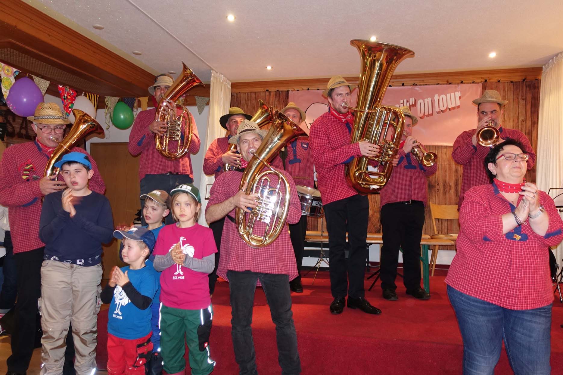 Selbst im früheren Schwimmbad, jetzt zum Hambacher Eckwaldfestsaal umgebaut, schlugen die Wellen nie so hoch wie dieses Jahr beim Saumusikabend. Dicht an dicht drängten sich die Besucher, selbst ein Stehplatz noch zu ergattern war schwierig. Und die Stimmung schlug alle Rekorde – sie war besser, wie im Kurfürstensaal in Mainz und all den großen Fasentbällen der Welt. Mit bestem Mutterwitz, treffsicheren Pointen und Mordsgaudi ging vier Stunden Schlag auf Schlag die Post ab. Die Mitglieder der Hambacher Kultband »Es rännt ä Sau de Garde na« waren wieder einmal in blendender Form und sorgten mit ihrem vierstündigen Programm vom Feinsten für Hochstimmung am laufenden Band.