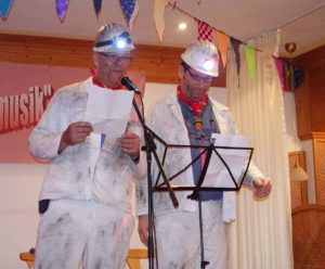 Wie im vergangenen Jahr gab es wieder Besuch vom Ehepaar Koslowski aus Wanne-Eickel (Thomas Hoog und Stefan Huber). Sie staunten, dass es in Unterharmersbach jetzt eine wunderbare Straße gibt und in Oberentersbach bei’s Gureths immer noch breite Nudeln, aber kein Breitband gibt. Dass die Bürgerwehrmänner beim Silvesteraufmarsch schon losballerten, ehe das Kommando kam, war ihnen auch nicht entgangen. Als besondere Überraschung kamen weitere Dörfler auf die Bühne, um für Ludwig Schütze ein Lied aus der Schlussnummer des Dörfleabends zu präsentieren.
