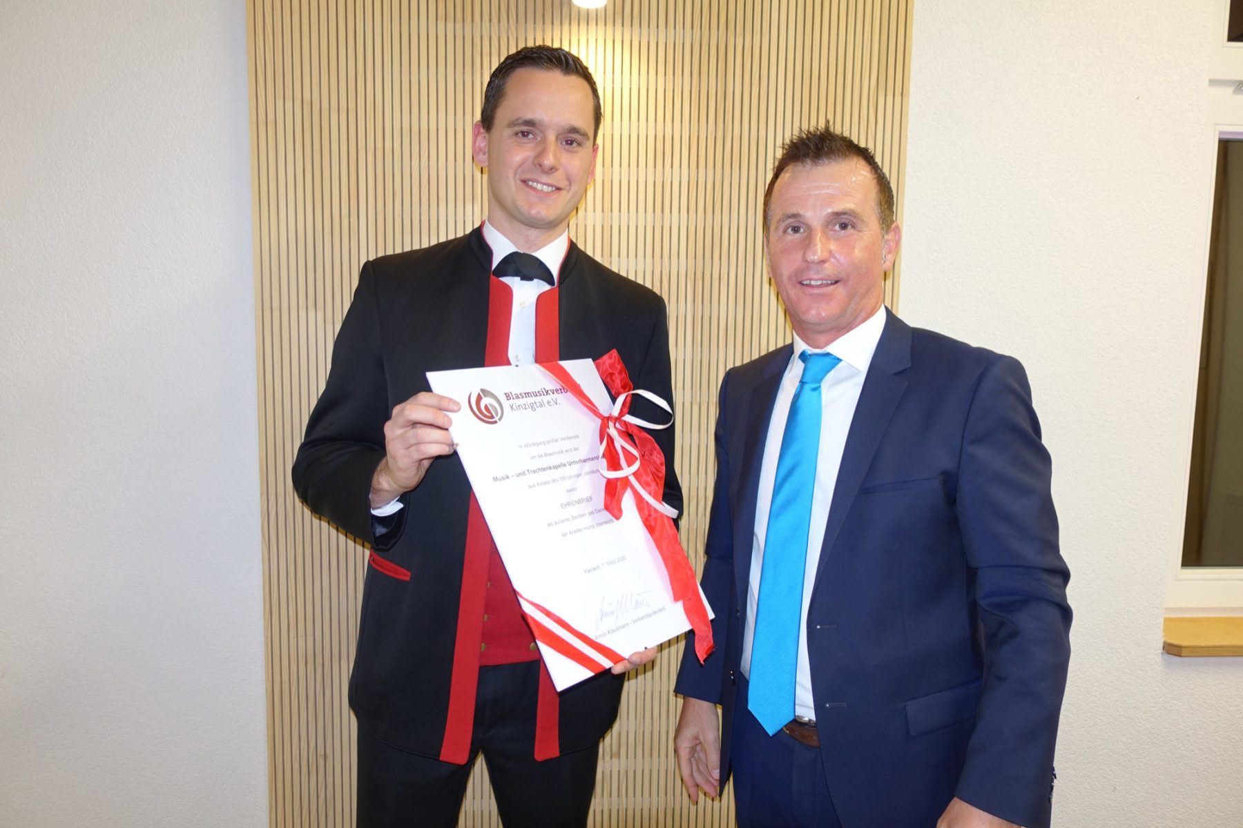 Schon 1958 hatte die Musikkapelle ihren ersten Fernsehauftritt in der Sendung »Bericht aus Bonn«, wo sie den »Alte-Kameraden-Marsch« auf Wunsch der großen Koalition spielte. 1976 wurde der Musikverein mit der Anschaffung der neuen, an die Bürgerwehr angelehnten Tracht in Musik- und Trachtenkapelle umbenannt. 1986 wurde die Bläserjugend gegründet, die heute 33 aktive Mitglieder zählt. Ein besonderer Höhepunkt war die Einrichtung des neuen Probelokals im Obergeschoss der Schule in kompletter Eigenleistung. Abschließend erklärte der Vorsitzende unter großem Beifall: »Mit dem heutigen Festbankett ist nun der Start für unser Jubiläum gegeben.«