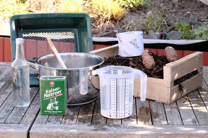 Basismaterial zur Zellstoffgewinnung sind Hackschnitzel oder Sägemehl. Auch Fichtenzapfen können – im Thermomix zerkleinert – Verwendung finden. Die restlichen Materialien finden sich in jedem Haushalt: Ein großer Topf und ein großer Kochlöffel, Wasser und hochprozentiger Schnaps als Lösemittel, Natron als Katalysator, ein Thermometer und natürlich eine Kochplatte. Dazu ein Sieb, um den Zellulose-Brei trocknen zu können.