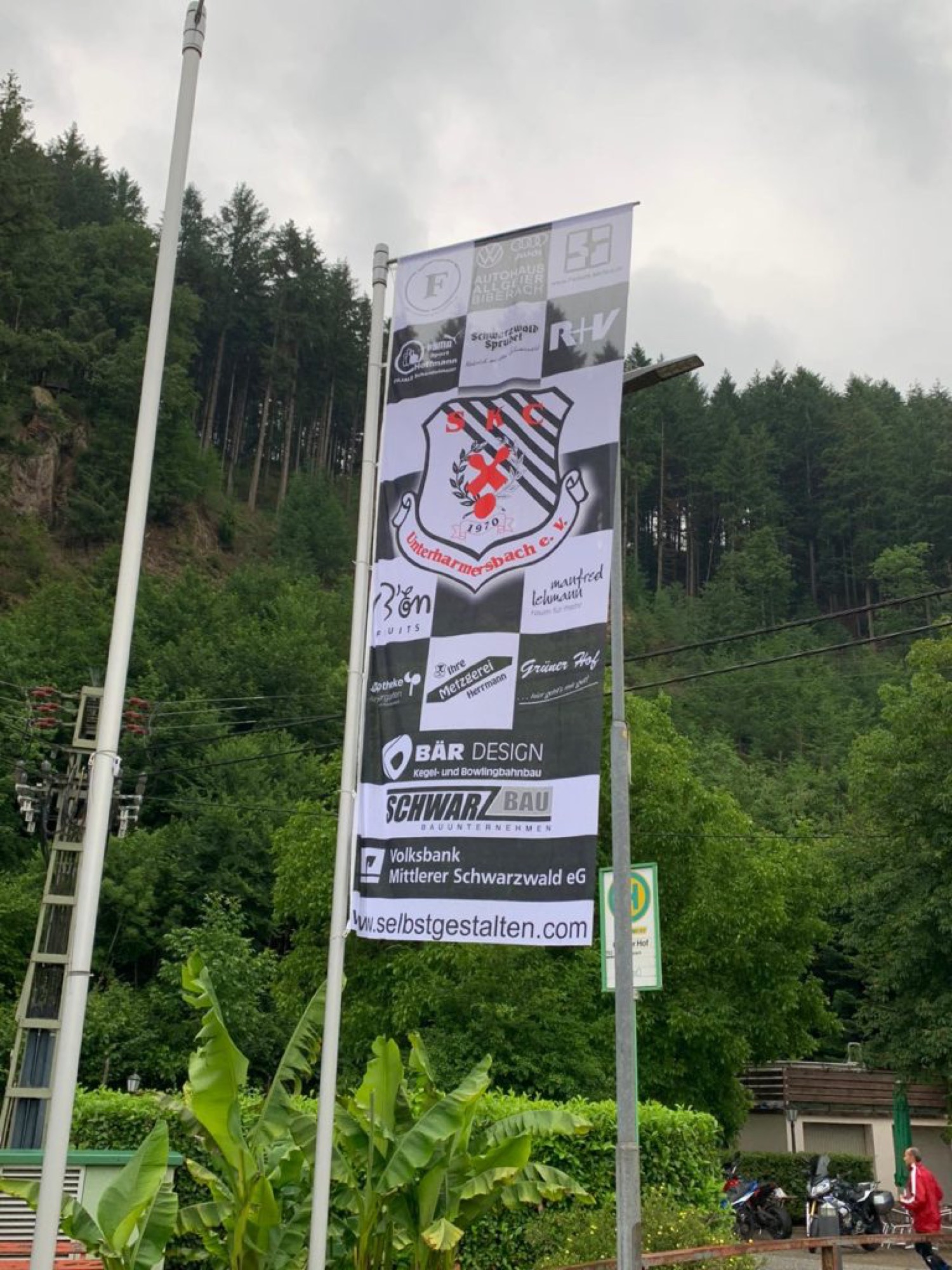 Nachdem die Fahne ordentlich fixiert wurde, konnte der Fahnenmasten mit vereinten Kräften dann aufgestellt werden. Der SKC Unterharmersbach bedankt sich mit dieser Aktion gleichzeitig bei seinen Textilsponsoren. Diese wurden in dem neuen Fahnen-Design zementiert: