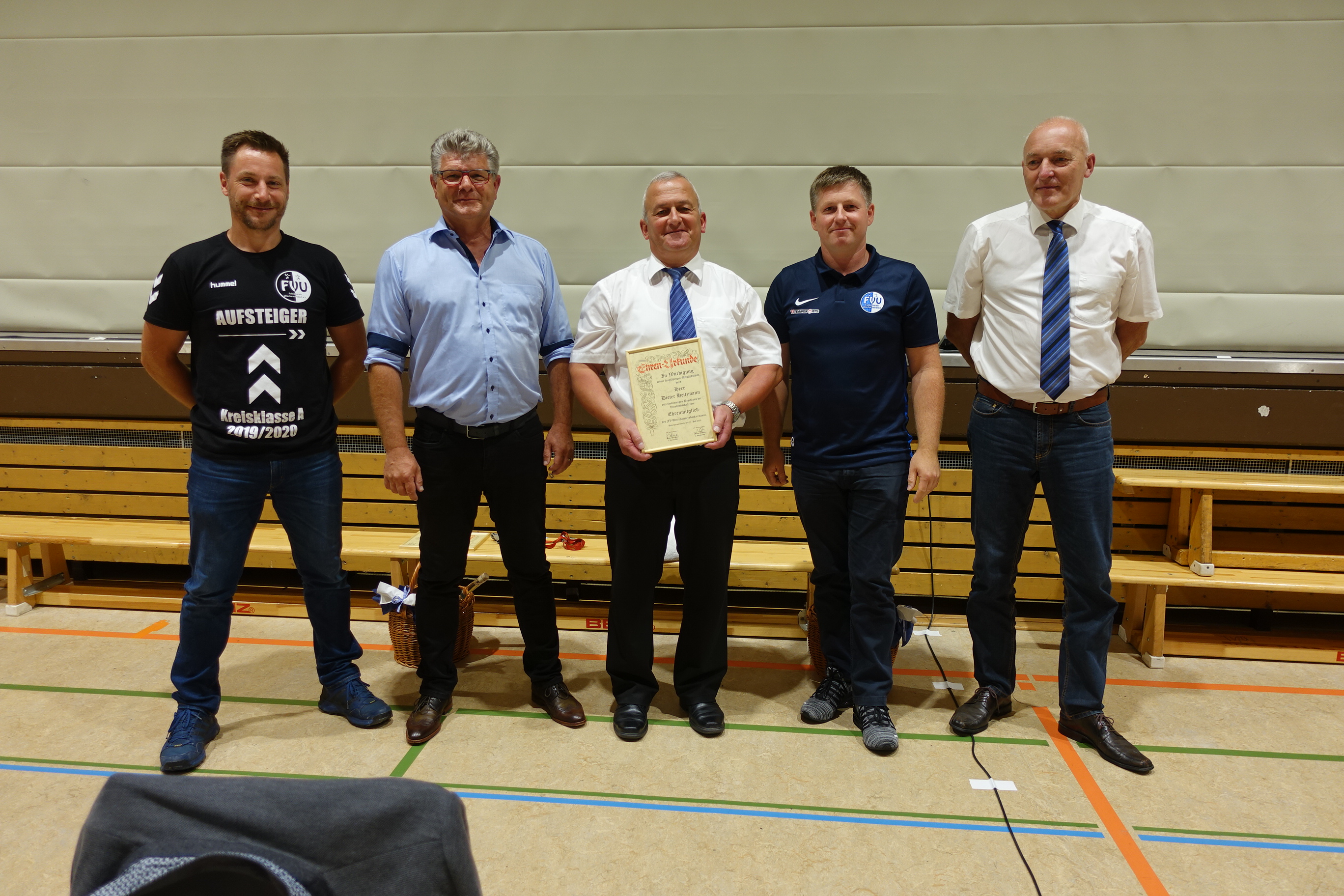 Jörg Leisinger dankte in seiner Laudatio: »Sage und schreibe elf Jahre lang von 2009 bis heute hast Du an der Spitze des FVU gestanden. Für diese großartige Leistung spreche ich Dir im Namen aller Mitglieder meinen höchsten Respekt aus.« In der Amtszeit von Dieter Heitzmann habe der FVU eine der erfolgreichsten Phasen der Vereinsgeschichte erlebt: Die Erste Mannschaft spielt seit Jahren mit hervorragenden Platzierungen in der Bezirksliga, das Clubhaus und das Eckwaldstadion wurden modernisiert und zum Schmuckkästchen ausgebaut, in dem sich alle sehr wohlfühlen. Außerdem gewann die Erste Mannschaft den Targo-Bank-Cup, was dem FVU einen satten Batzen Geld für die Vereinskasse und ein unvergessenes Heimspiel gegen Werder Bremen bescherte. Zudem wurde das 65-jährige Bestehen des Vereins unter seiner Federführung sehr ansprechend und sehr würdig gefeiert. Als echter Macher habe, so Leisinger, Dieter Heitzmann beim FVU große Spuren und große Schuhe hinterlassen: Sieben Jahre lang war er vor seiner Wahl zum Vorsitzenden stellvertretender Jugendleiter und gemeinsam mit dem legendären Schülli-Alfons habe er den FVU-Jugendförderverein aus der Taufe gehoben. Ehrenamtlich habe Dieter Heitzmann unendliche viele Stunden für den FVU aufgewendet und sich in jeder freien Sekunde das Hirn zermartert, wie der Verein noch besser aufgestellt werden könne. Für Heitzmann sei dieser Einsatz stets selbstverständlich gewesen, und in seiner Bescheidenheit würde er jetzt vermutlich sicher sagen »Des passt scho«.