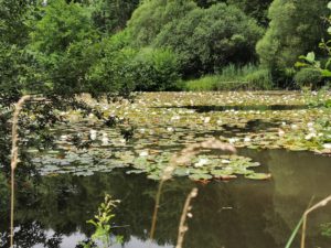 Jetzt wurde auf dem Flößerpfad, immer der Kinzig entlang, bis nach Alpirsbach gewandert. Auf verschiedenen Tafeln entlang des Pfades werden immer wieder Details über die Flößerei beschrieben, welche bis ins Jahr 1895 auf der Kinzig betrieben wurde. Stolze Bauernhöfe gibt es entlang des Weges, ebenso ein kleiner See mit blühenden Seerosen.