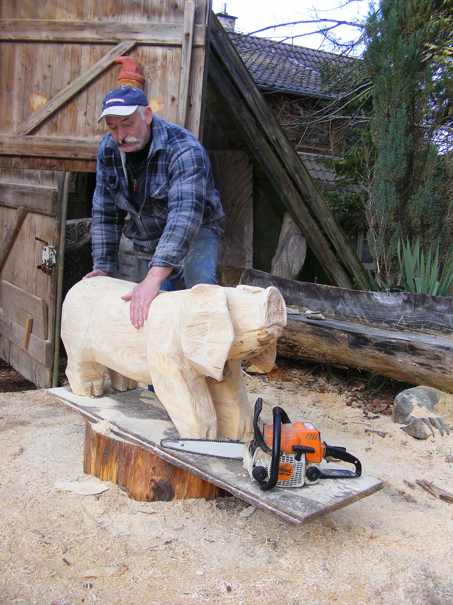 In jedem Haus mit Holzofen gab es vor fünfzig Jahren Axt und Beil. »Beide waren fester Bestandteil des Hausrats«, erinnert sich Gustl Schwarz, Enkel des legendären »Wittezimpfer«. Derweil hat die Kettensäge längst die Axt abgelöst. Wer damit umgehen kann, erliegt irgendwann dem Versuch, sein Werkzeug gestalterisch einzusetzen.