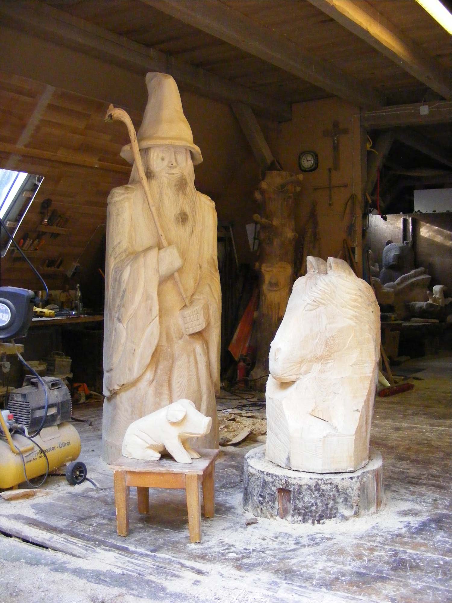 Beim Öffnen der Ateliertüren erschließt sich ein ausladender Blick in Richtung Knopfbauer. Die Wiese ist von Wald gesäumt. Vor Arbeitsbeginn atmet Gustl ein paarmal tief durch. Diese Kulisse und die frische Luft, das ist der Stoff aus dem der Kunstschaffende die Kraft für neue Ideen und Projekte bezieht. Schäferhund Enie kommt um die Ecke. Er hat den Ball in der Schnauze und will spielen. Nicht lange, dann kommen die ersten Wanderer vorbei. Gustl konzentriert sich auf seine Arbeit und muss trotzdem Fragen beantworten. Im Advent bekam er Besuch aus den Vereinigten Staaten. In seine Arbeit vertieft bemerkte er plötzlich eine Hand auf seiner Schulter. Hinter ihm stand ein Mann wie ein Bär mit einem Händedruck, der ihm das Wasser in die Augen trieb. Jim Lewis, der jüngste Spross einer Holzhändlerdynastie in Oregon. »Was machst Du hier? Das ist großartig!« Jim war in einem nahe gelegenen Hotel untergebracht. Seine Frau wollte sich ein Dirndl kaufen. »Dazu braucht sie mich nicht. Sie hat meine Kreditkarte und ich meine Ruhe.« Jim wollte sich derweil im Wald umsehen. Er war vernarrt in Gustls langbärtige Großvaterfigur und machte ein Handyfoto. Gerne wollte er den hölzernen Kerl als »Doorman« am Zufahrtsportal seiner Firma aufstellen. Bei der Frage, ob Gustl einen Überseeverschlag für den Schiffstransport des hölzernen Kerls anfertigen kann. winkt dieser ab. Er weiß wohl um das wirtschaftliche Potenzial seiner Arbeit Bescheid. Die Schnitzerei soll Hobby bleiben und nicht in Stress ausarten. Was er sich hier erarbeitet ist für den Eigenbedarf. So wie andere Leute ihre Tapeten und Klamotten wechseln, hält er es mit dem Außenmobiliar. Jedes Frühjahr kommt eine neue Kollektion.