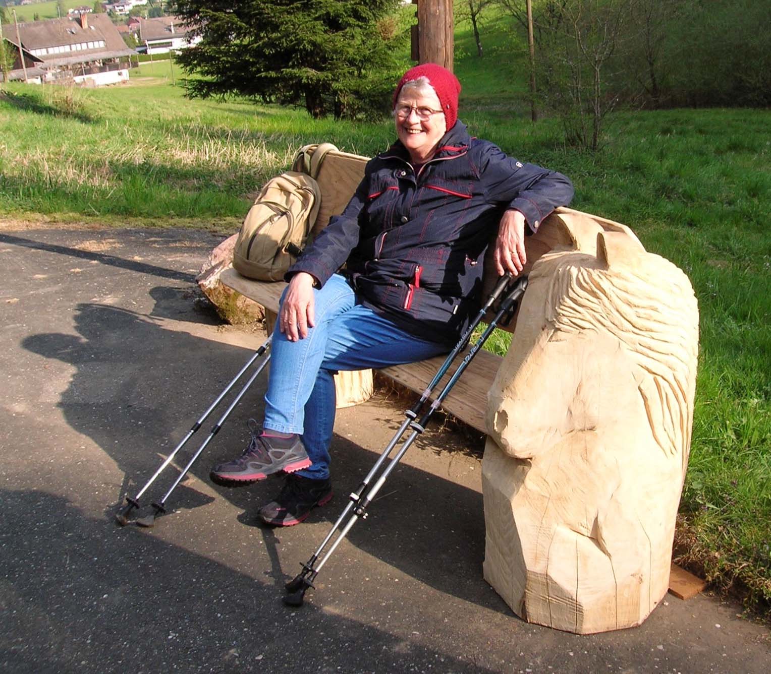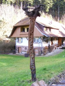Foto: Manfred OestreichEs mag nun vierzehn Jahre her sein, da entdeckte Gustl in einer Musestunde sein schöpferisches Talent. Er schuf Sterne und Herzen aus Holz. Gustl ist Autodidakt. Mit wachsender Begeisterung hat er sein Können weiterentwickelt. Heute hat diese Kreativität einen festen Platz in seinem Alltag. Die geräumige Scheune ist seine Werkstatt. Der heimische Wald vor dem Atelier als Sauerstoff- und Rohstoffquelle wird ihm, so hofft er, noch lange erhalten bleiben. Die geschaffenen Objekte sind größer geworden. Das Umfeld seines Hauses wurde mit Tierfiguren und Mobiliar aus eigener Fertigung aufgewertet. Jedes Jahr zur Weihnachtszeit ist zur Freude der Passanten die Heilige Familie auf dem Balkon aufgestellt. Die Krippe unterm Walmdach, in der Gesamtheit ist das Gustls Wintermärchen im Schwarzwald. Ebenerdig ist ein riesiger Grizzly zu sehen. Im Zufahrtsbereich weist eine Holzsäule mit dreidimensionaler Schrift »Knopfholz 2« den Weg zur Familie Schwarz. Massive Bänke mit Pferde-, Löwen- und Krokodilköpfen laden erschöpfte Wanderer zur Rast ein.