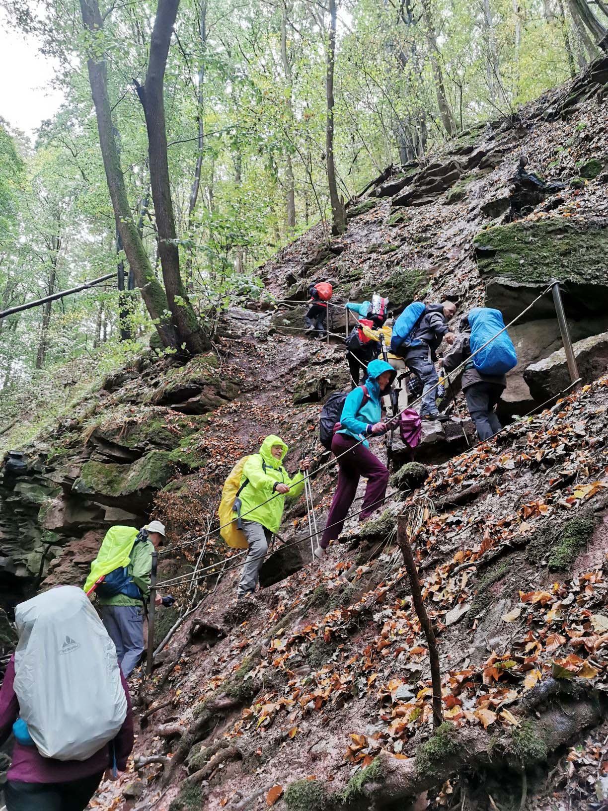 Aufgrund des Wetters wurde die Tour umgeplant. Über Neckargerach steuerte man die Margarethenschlucht an, welche eine Schlucht im Odenwälder Buntsandstein zwischen Neckargerach und Mosbach ist und auf dem Neckarsteig liegt. Der Flursbach überwindet hier 110 m auf acht Wasserfallstufen. Ein Wanderweg folgt dem Verlauf der Schlucht. Die Wandergruppe stellte sich der Herausforderung und folgte diesem Weg, was ein kleines Abenteuer war. Der Pfad ist mit Seilen und Geländern gesichert. Doch die hohen Stufen und durch den Regen aufgeweichte Pfade verlangten von der Gruppe schon einiges ab. Für alle war es ein Abenteuer und alle kamen wohlbehalten oben an. Wie für uns gemacht tauchte auch gleich eine Schutzhütte auf. Somit beschloss man, dass man eine Pause einlegt. Wer weiß, was noch kommt.