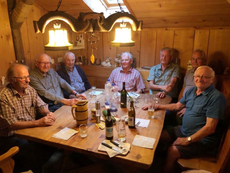 Der FVU-Ehrenamtsbeauftragte Thomas Breig schaute vorbei, als Gieringer (links) mit seinen Wanderfreunden nachträglich auf seinen Geburtstag anstieß, und überreichte ein Weinpräsent und die guten Wünsche des Vereins.