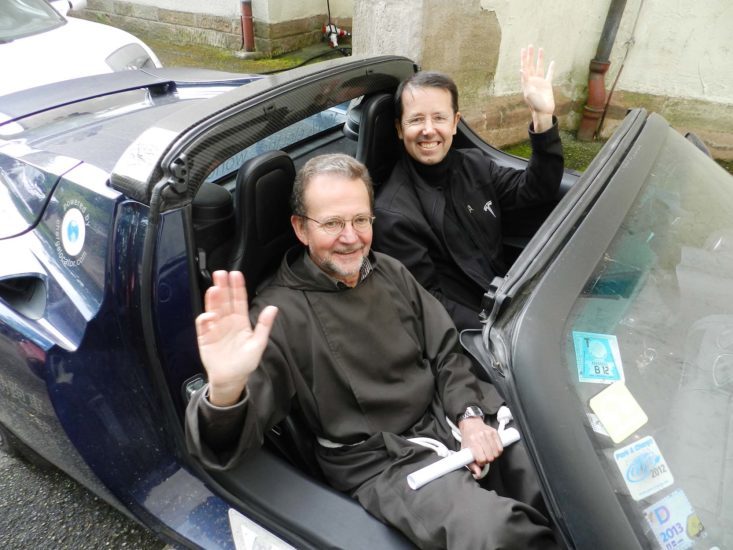 vielen Stoßgebete erhielt Bruder Karl von seinem einstigen Schüler eine Ladestation spendiert. Bruder Karl segnete die 10 Tesla-Fahrzeuge und ihre Fahrer. Und gemeinsam erklang zum Abschluss aus kräftigen Männerkehlen mit der Bitte um Schutz und Schirm »Maria breit den Mantel aus.« Bestimmt hat sie das auch getan, als Rafael de Mestre am 15. Juli letzten Jahres bei einem schweren Unfall mit Totalschaden die Leitplanke durchbrach – und doch nur leicht verletzt war.