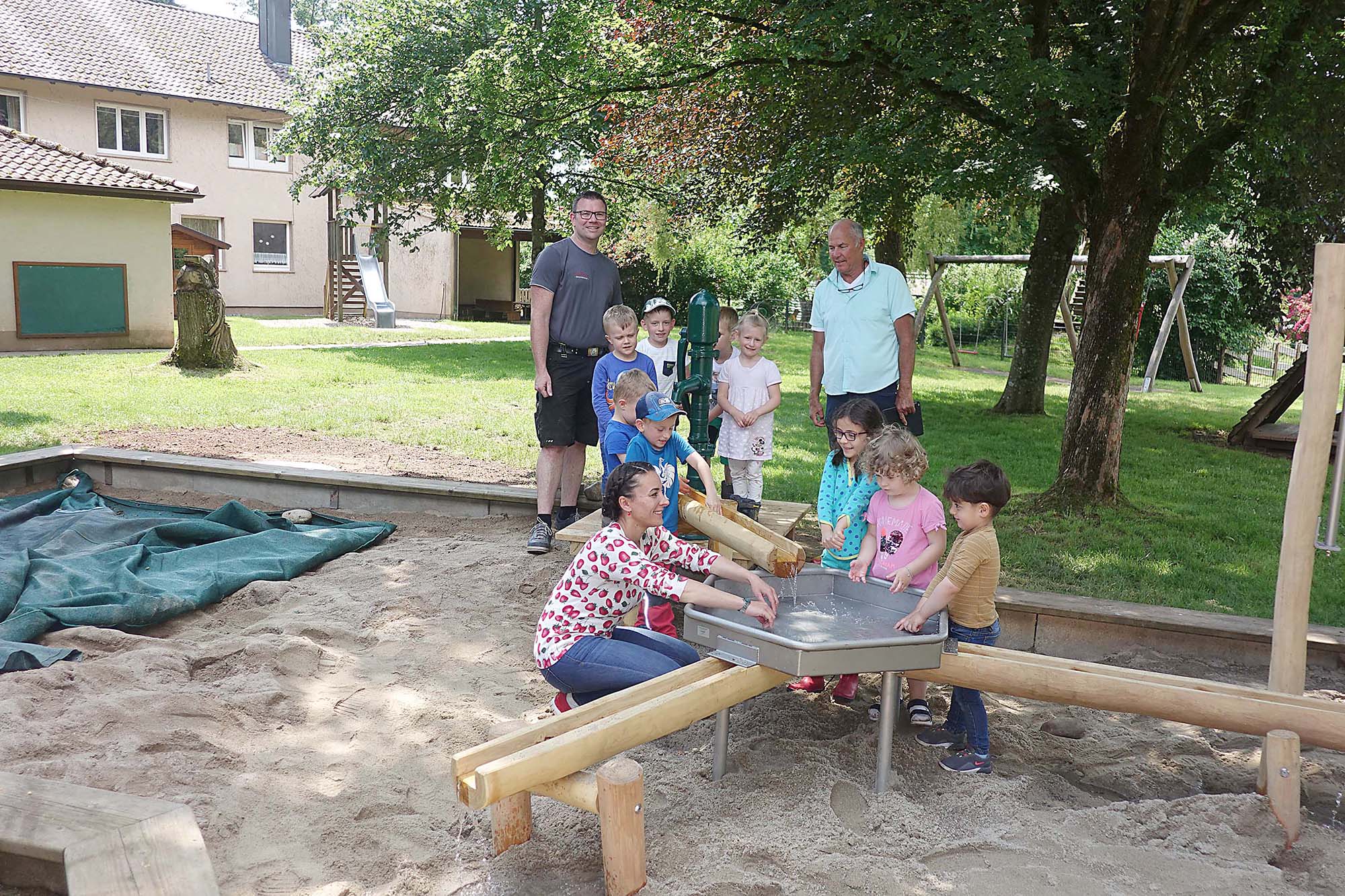 Mit einer Schwengelpumpe wird Wasser in drei verschiedene offene hölzerne Leitungen gepumpt, um den Sand in der Grube richtig mit Wasser zu Matsch zu vermengen. Matthias Fritsch, Spielplatzbeauftragter der Stadt Zell, freute sich, dass die Anlage läuft und bei den Kindern so gut ankommt. Die nostalgische Wasserpumpe wird seit 30 Jahren im norddeutschen Ahrensburg für Spielplätze in ganz Deutschland gefertigt und zählt zu den Marktführern. Das Wasser kommt aus der öffentlichen Wasserleitung und ist auch ausdrücklich als Trinkwasser geeignet. Matthias Fritsch nahm die Gelegenheit wahr, den Erzieherinnen herzlich zu danken, dass die Spielgeräte so gut gepflegt werden. Wenn die Mitarbeiter zum Mähen anrücken, ist alles, was dem Rasen liegt, weggeräumt und die Arbeit kann sofort beginnen, so Fritsch.
