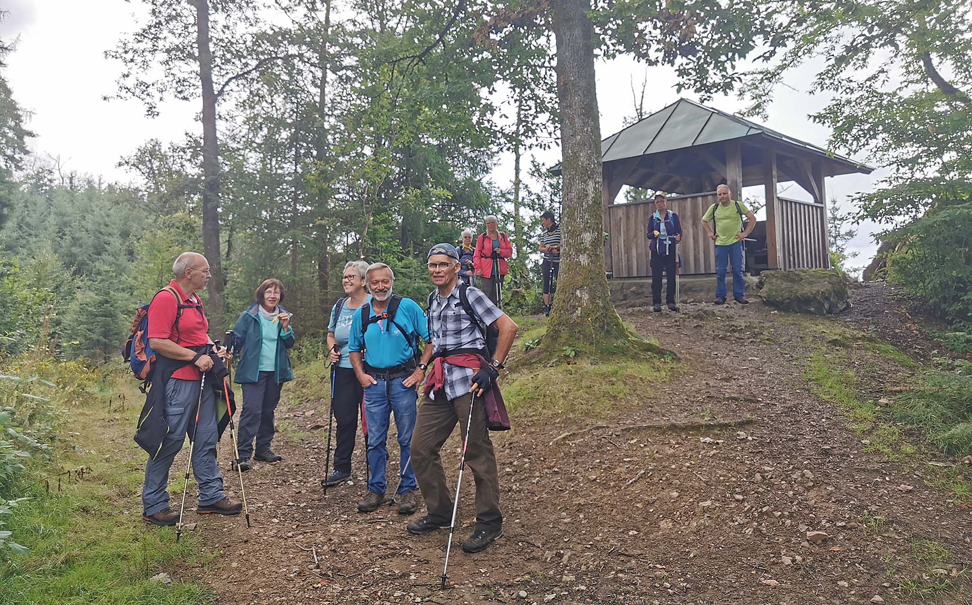 Vom Wanderparkplatz an der Zeller Keramik verlief die Tour aufwärts bis zum 427 Meter hohen Badwaldkopf zum dortigen Funkmast. Weitergewandert wurde auf dem Kammweg zu einer Sitzgruppe mit Ausblick nach Zell und weiter zur Siegfried- Liebert Hütte auf dem Hangerer Stein. Dort gab es tolle Aussicht nach Biberach und ins Kinzigtal. Die dunklen Wolken Richtung Gengenbach ließen nur eine kurze Pause zu. Bis zum Eichgraben-Eck war noch eine kleine Steigung zu bewältigen.