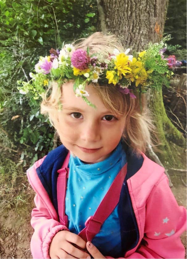 Der nächste Tag wurde dem Thema »Wiese – was blüht denn da?« gewidmet. Es wurden verschiedene Blumen, auf der Wiese, beim Pavillion gesucht. Auf einem großen Tuch wurden die Blumen ausgebreitet und ihre Struktur (Hauptwurzel, Wurzelhärchen, Keimblatt, Stängel, Kelchblatt) bestimmt. Danach entstanden viele kleine Kunstwerke – Bilder aus Blüten und Walderde. Natürlich durften auch diese schönen Blumenkränze nicht fehlen.
