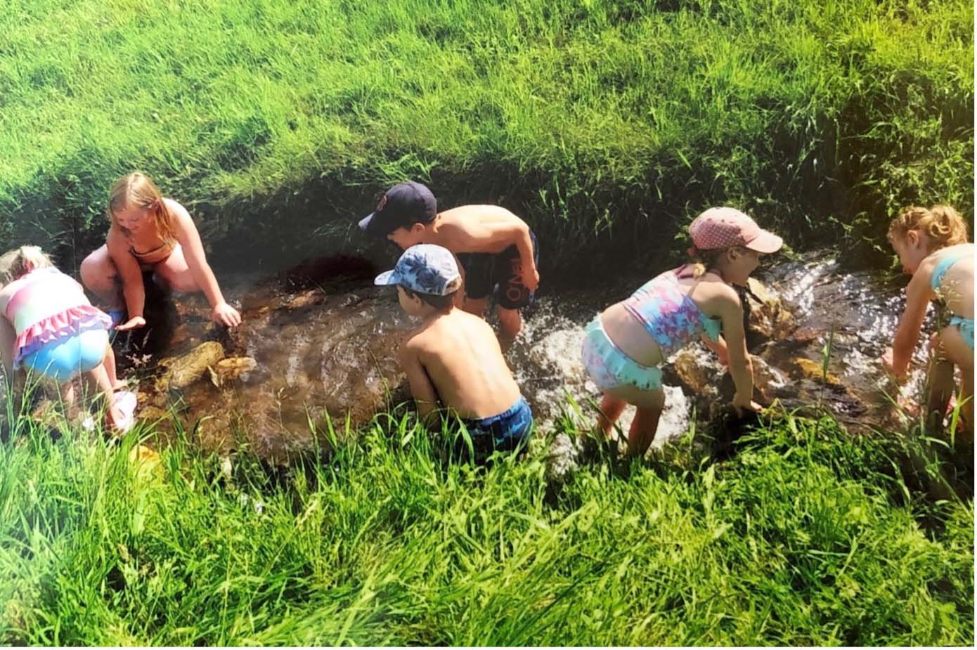 Zum Abschluss der Waldwoche verbrachten die Schulanfänger den Tag am »Schreilegrundbächle«. Inhalte dieses Tages waren: Wasser berühren, fühlen, Geräusche erzeugen und entdecken, was im Bach so alles lebt. Die erlebnisreiche Woche endete schließlich mit einer Überraschung. Eine Erzieherin kam mit Vanilleeis und Beerenmus vorbei. Es waren schöne Tage, die viel zu schnell vorbeigingen.