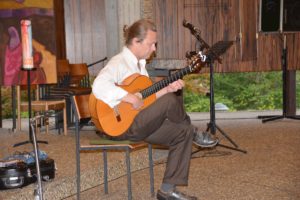 Dem lauschigen Sommerabend, den Petrus beim 4. Konzert der »Zeller Sommermusik« leider nicht gewährte, huldigte Achim Langenkämper dafür mit einer melodiösen Meditation auf der Gitarre, wobei er seine Vorliebe für Arpeggien und wendige Läufe erkennen ließ, die sich spontan aus den Akkorden lösen. Eindrucksvoll auch der pianissimo Ausklang mit einem wie gehaucht klingenden Basston.