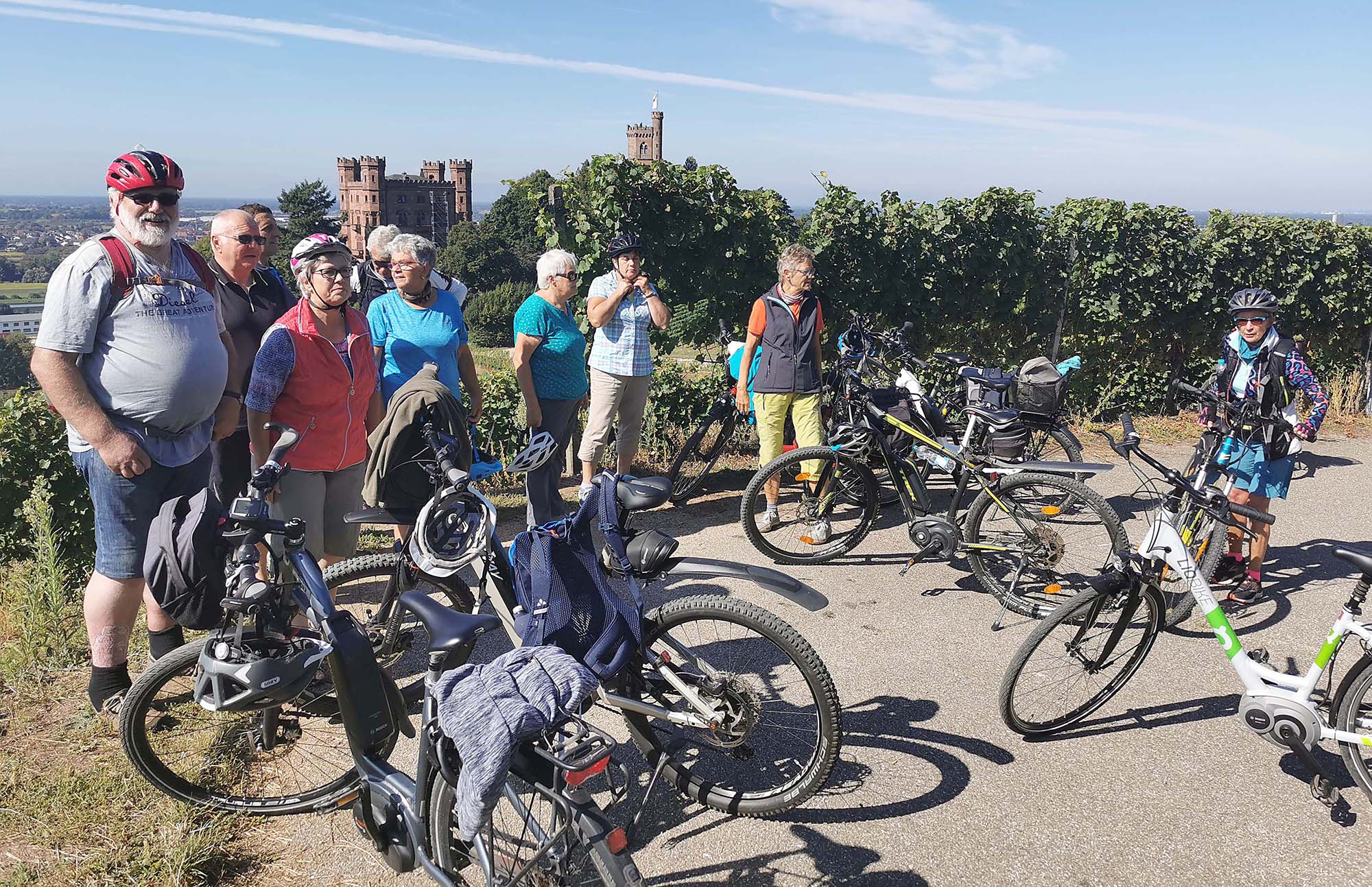 Auf dem Radweg wurde bis Schwaibach geradelt und weiter über den Kinzigdamm, an Gengenbach vorbei, durch Ohlsbach bis kurz vor Ortenberg. Dort stand eine Steigung durch die Reben an. An einem herrlichen Aussichtspunkt beim Schloss Ortenberg wurde kurz gerastet, um die Aussicht zum Schloss und ins Kinzigtal zu genießen. Kurze Zeit nach dem Aufbruch stand dann eine erneute aber ausgiebige Pause an, um das mitgebrachte Vesper zu verzehren. Vor den Radlern lag Offenburg und auch die Vogesen und das Münster in Straßburg waren zu erkennen. Zur Verdauung gab es einen feinen Quittenlikör, spendiert von einer Teilnehmerin.