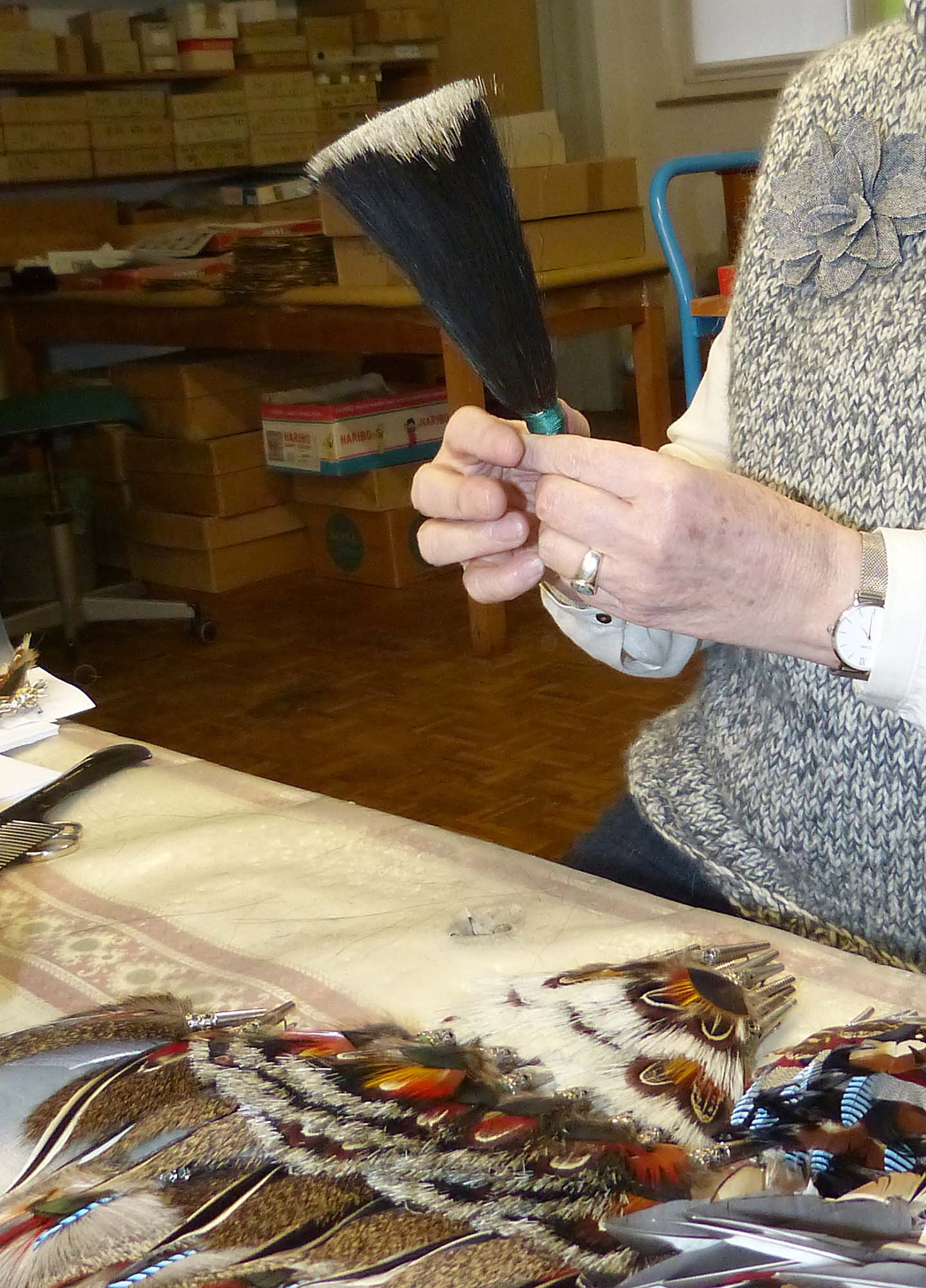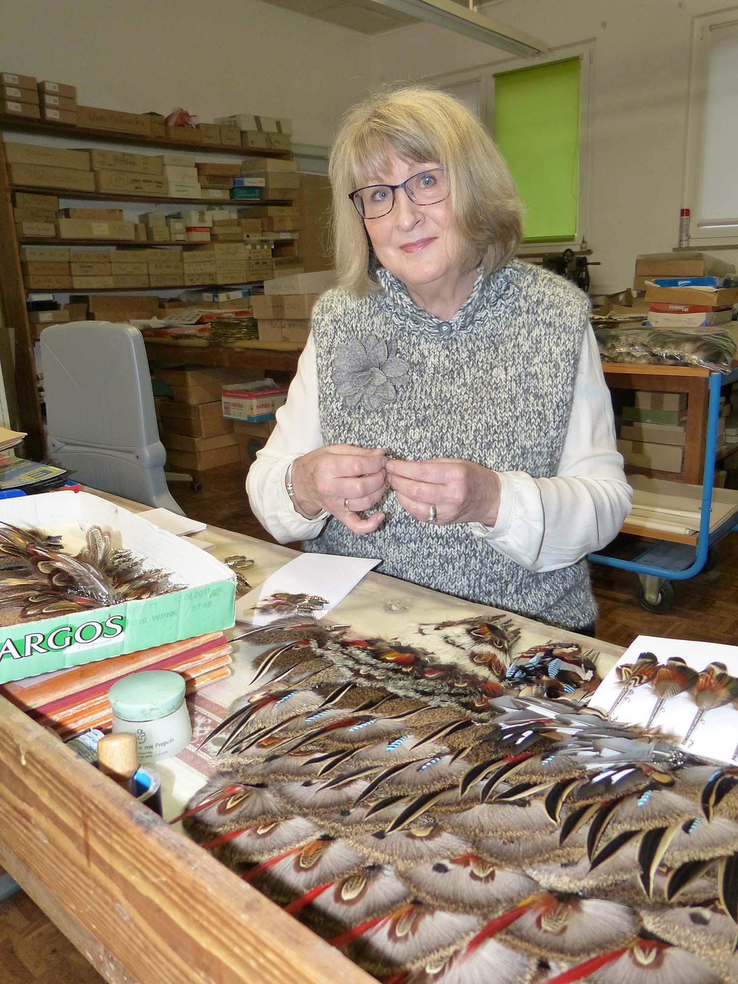 Zu Hoch-Zeiten waren zwanzig fest angestellte Mitarbeiter und zwanzig Heimarbeitskräfte bei der Hutschmuckmanufaktur in Lohn und Brot. Heute sind es nur noch drei Heimarbeitskräfte, und im stark verkleinerten Produktionsraum werkeln eine Vollzeitkraft und drei Teilzeitkräfte gemeinsam mit der Manufakturchefin. An Holztischen, denen man ihren zig Jahrzehnte währenden Einsatz ansieht. Regale voller robuster, teils vergilbter Pappschachteln, in denen Federn und Zubehörteile in unterschiedlichen Verarbeitungsgraden lagern, tun ihr Übriges, Zeitungspapier und Mottenpulver schützen die tierischen Schätze.