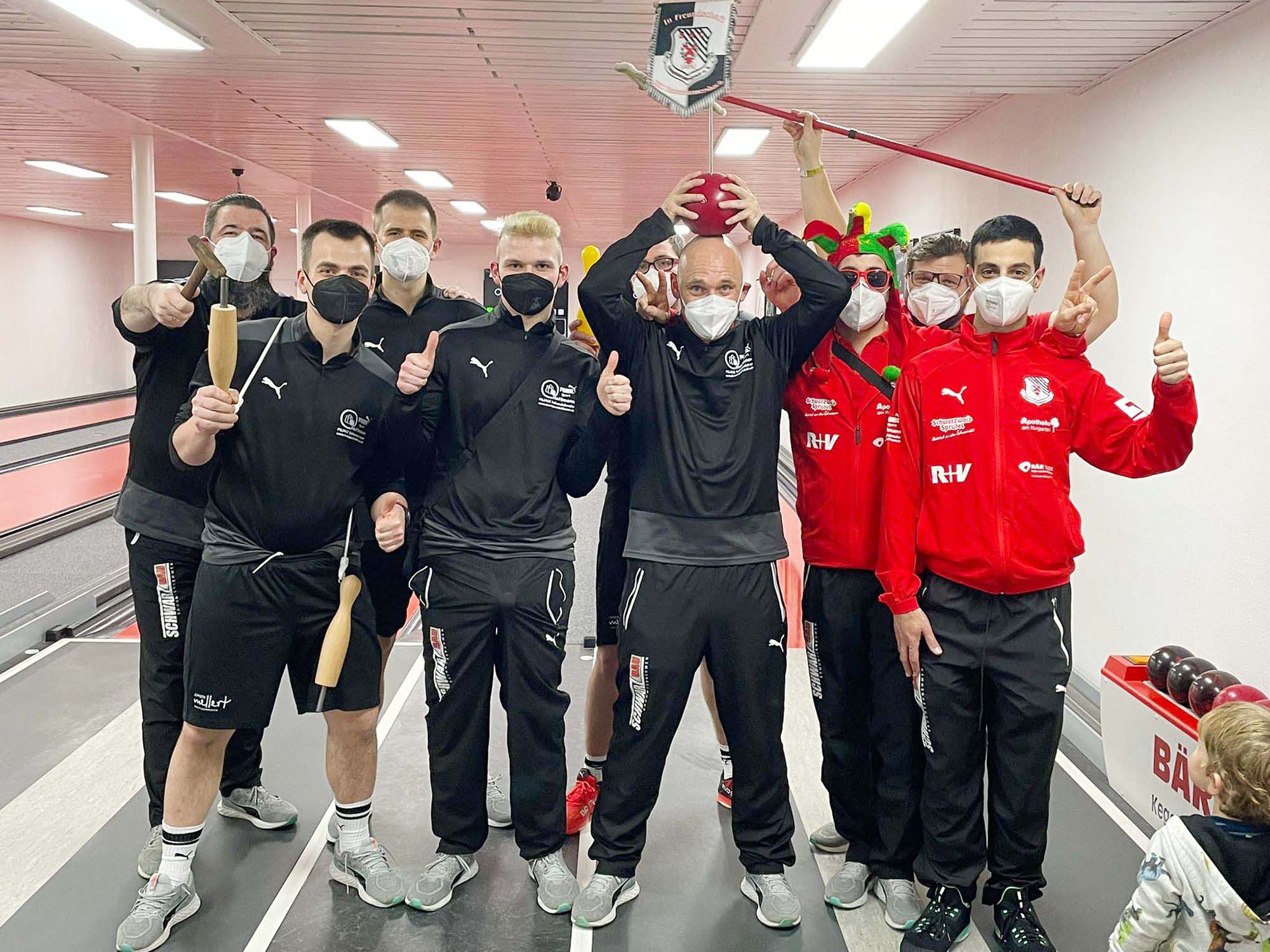 Danach zwei Duelle auf gleichem Niveau. Kristof Adam (441 Kegel) und Erik Brucher (445 Kegel) unterlagen gegen Bernhard Neef (500 Kegel) und Herbert Schrempp (494 Kegel).