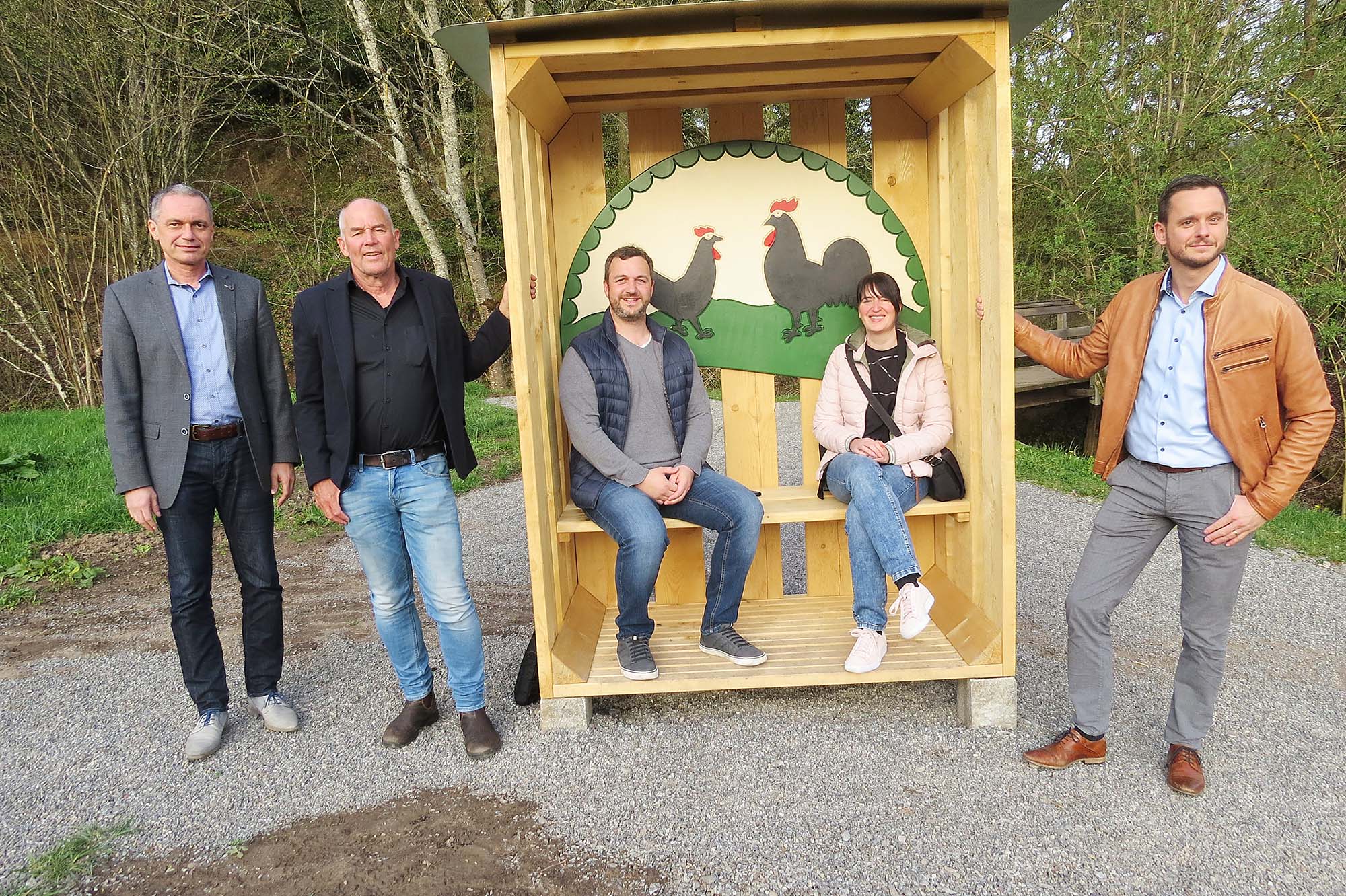 Passend dazu befindet sich eine Sitzgelegenheit, die eine Obstkiste symbolisieren soll – mit schönem Hahn und Henne Motiv auch optisch ein Hingucker. Große in den Boden eingelassene Mühlsteine weisen dem Wanderer die Laufrichtung zum Beginn des Wanderweges. »Diese Mühlsteine waren eine Idee des Betriebshofs und machen sich richtig gut«, informierte Ortsvorsteher Schütze. Ausdrücklich lobte er die Mitarbeiter des Betriebshof, die sich unter dem Leiter Matthias Fritsch mit eignen kreativen Ideen und vielen Arbeitsstunden für den Parkplatz eingesetzt haben. Die Firma Reiff hat zudem noch einen Findling auf eigene Kosten versetzt.