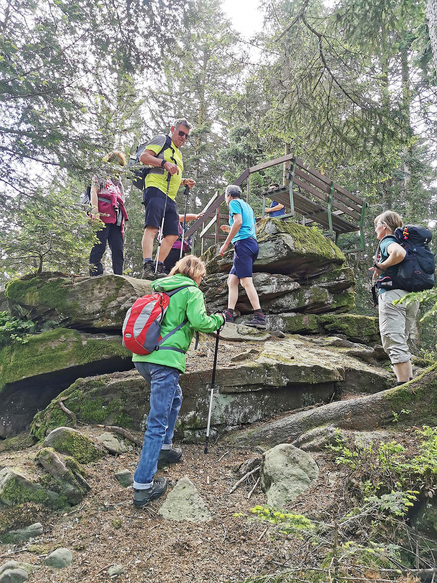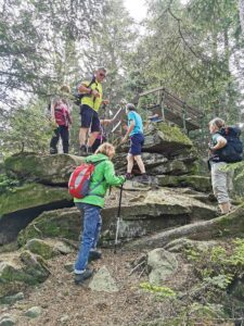 Der Wander- und Freizeitverein Unterharmersbach fuhr mit der Bahn nach Alpirsbach. Dort wurden die Wanderer von Wanderführerin Waltraud Kopp schon erwartet. Die Tour führte vorbei am Kloster ins Naturschutzgebiet Glaswald/Glaswiesen. Dort gab es einen Brunnen und eine Sitzgruppe. Genau der richtige Platz für die erste Rast! Nach einer kleinen Stärkung gab es Sekt für alle. Es folgte ein weiterer Anstieg bis zum Bergkamm, wo ein schmaler Wurzelpfad entlang der badisch-württembergischen Grenze bis zum Zollernblick führte. Die kleine Erhebung wurde bestiegen und man konnte sogar trotz des Blütenstaubes die Burg Hohenzollern erkennen. Weiter ging es auf dem Kammweg, an dem rechts und links die Steine und Bäume stark mit Moos bewachsen waren. An der Bettelmännlehütte wurde der Kammweg Richtung Rinkenbach verlassen. Die Wanderführerin hatte auf dem Rinkenbachhof ein zünftiges Bauernvesper vorbestellt. Es fiel allen schwer von diesem wieder aufzustehen, doch der Zug in Schenkenzell musste pünktlich erreicht werden. Alle bedankten sich für die hervorragende Bewirtung. Der Zug in Schenkenzell wurde nach 15 Kilometern Wanderstrecke knapp erreicht, so dass kaum Zeit war sich für die tolle Führung der Tour zu bedanken.
